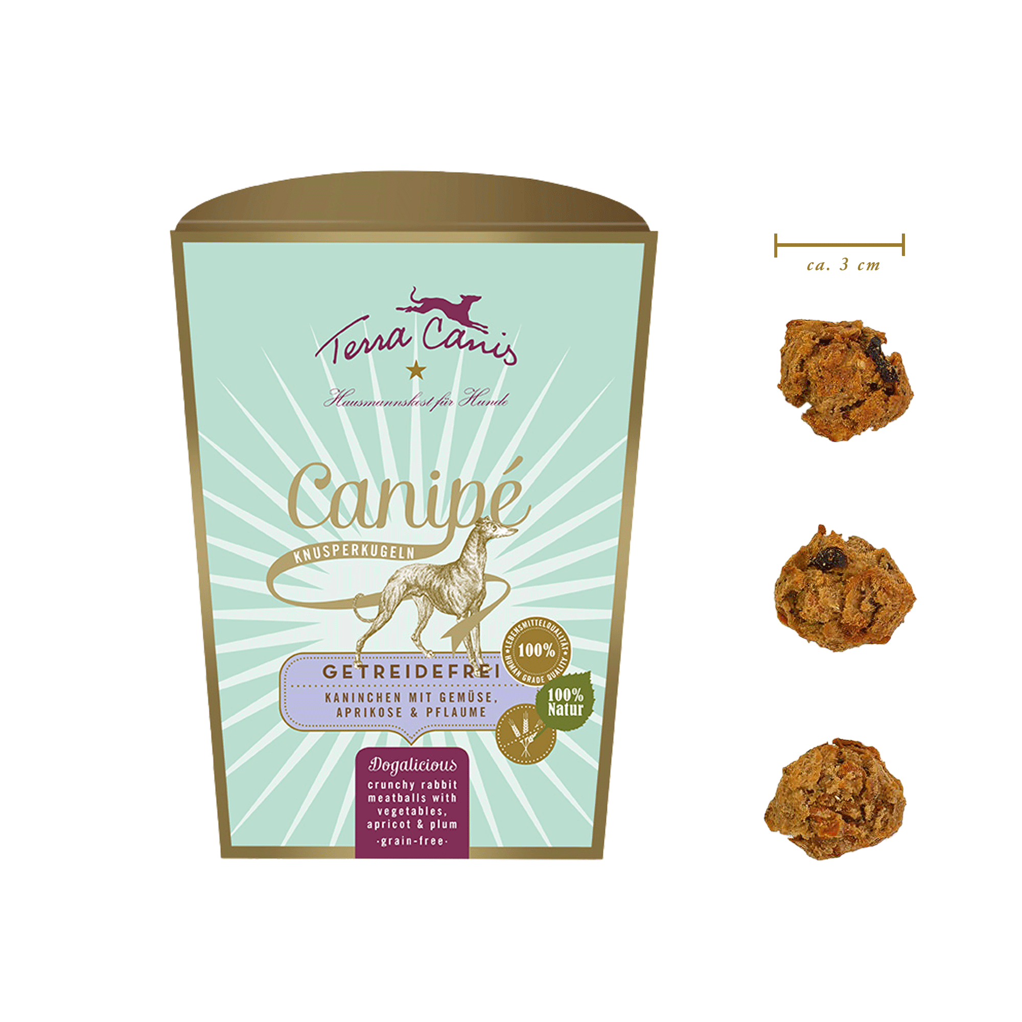 Die Terra Canis Canipé Knusperkugeln sind liebevoll in einer deutschen Manufaktur handgefertigt und überzeugen durch ihre hohe Lebensmittelqualität. Sie bestehen aus frischem Muskelfleisch vom Kaninchen, kombiniert mit gesundem Gemüse, Obst und Kräutern – alles ohne synthetische Zusätze. Dieser getreidefreie Snack ist ideal für Hunde mit sensibler Verdauung oder getreidefreier Ernährung. Die feine Rezeptur mit Süsskartoffel, Aprikose und Pflaume sorgt für natürlichen Geschmack und wertvolle Nährstoffe. Canipé ist ein echtes Naturprodukt mit individueller Optik, das jeder Hund lieben wird.
