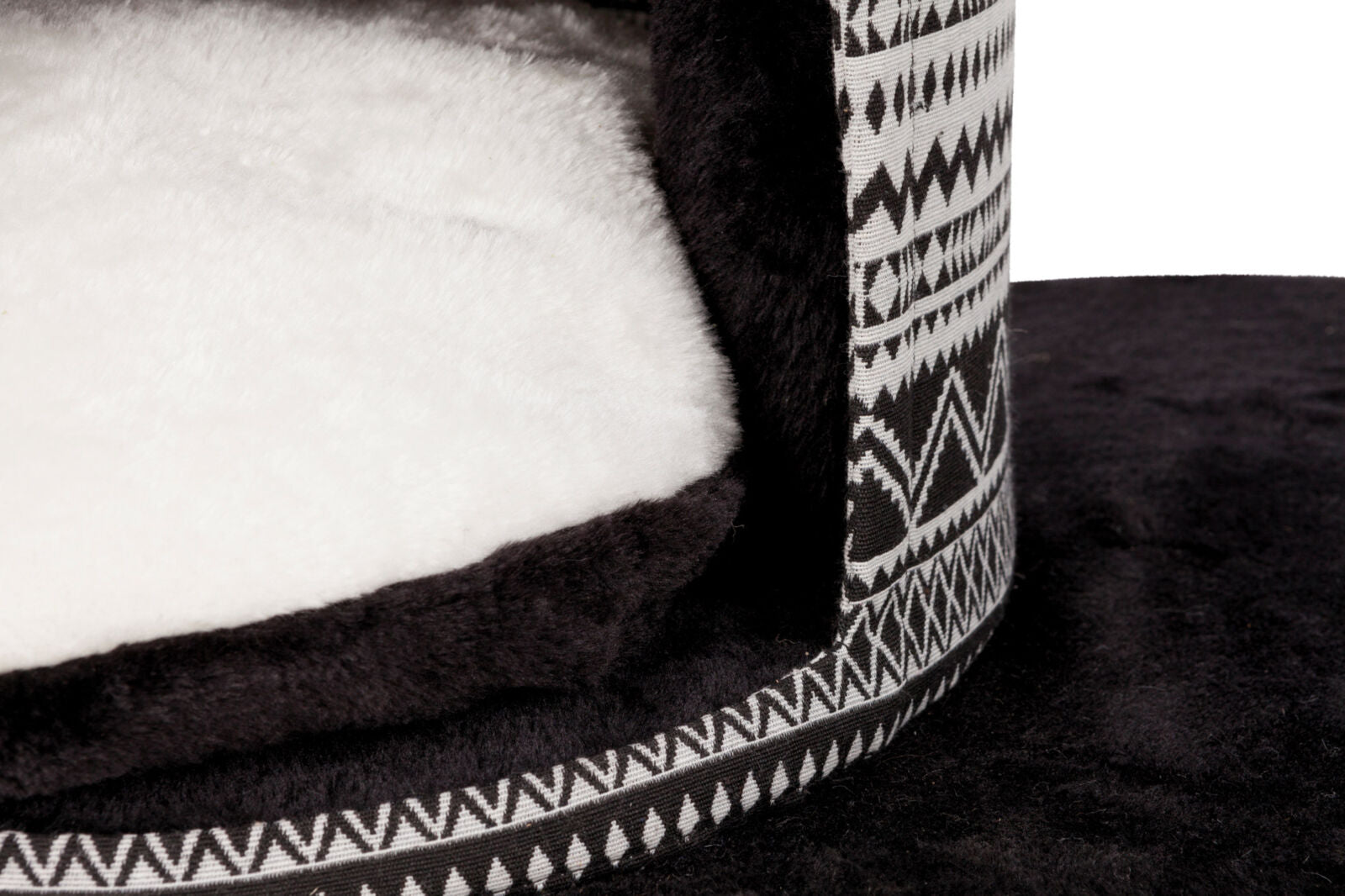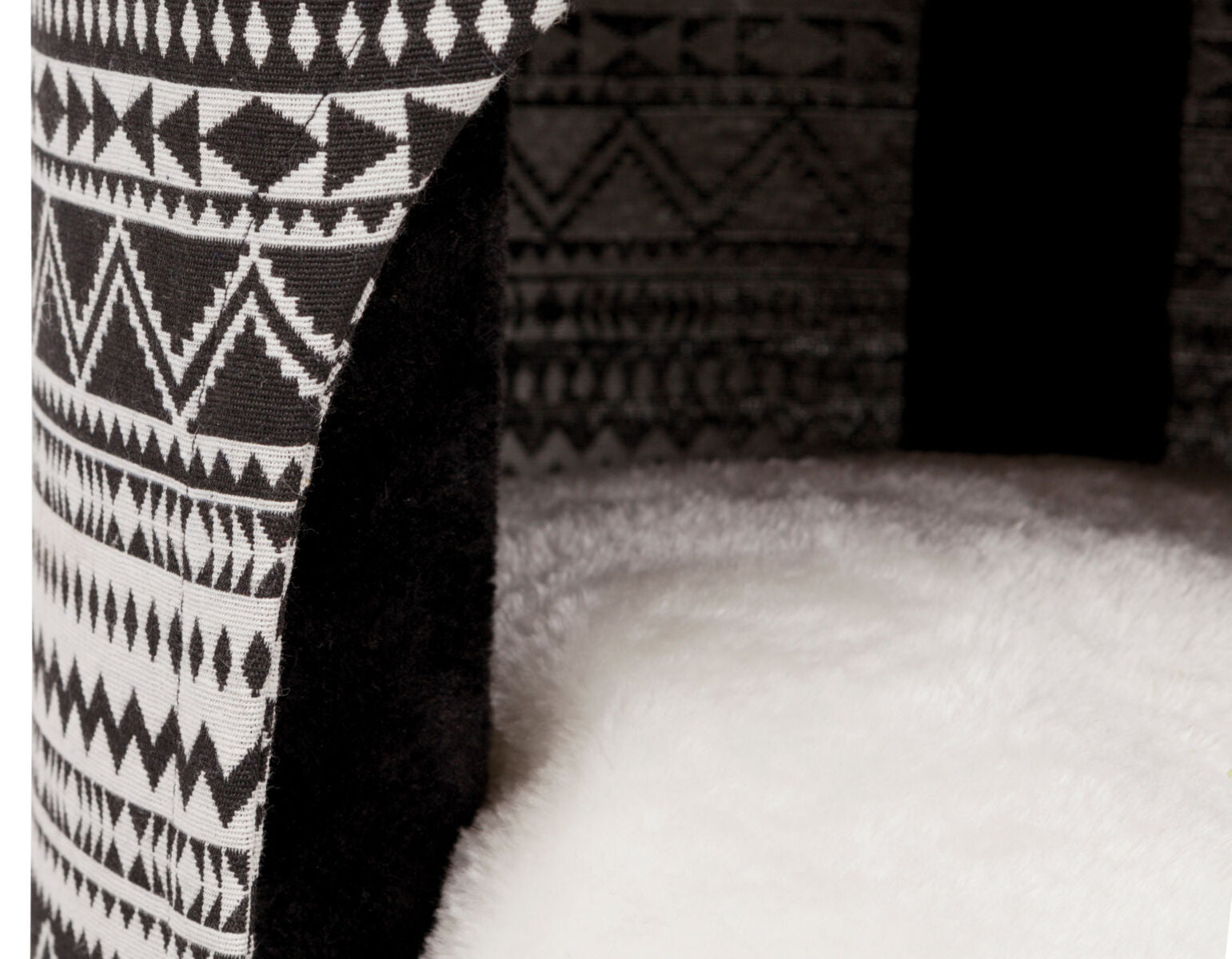 Der Trixie Kratzbaum Giada in Schwarz/Weiss bietet Katzen auf 112 cm Höhe vielfältige Möglichkeiten zum Klettern, Kratzen und Ausruhen. Gefertigt aus Sisal und Plüsch, verfügt er über eine Höhle aus Webstoff mit Wendekissen (Handwäsche), eine Hängematte mit stabilem Metallrahmen und eine gepolsterte Liegeplatte mit abnehmbarem Kuschelbett (Handwäsche). Dieser Kratzbaum vereint Komfort, Stabilität und Beschäftigung auf stilvolle Weise.