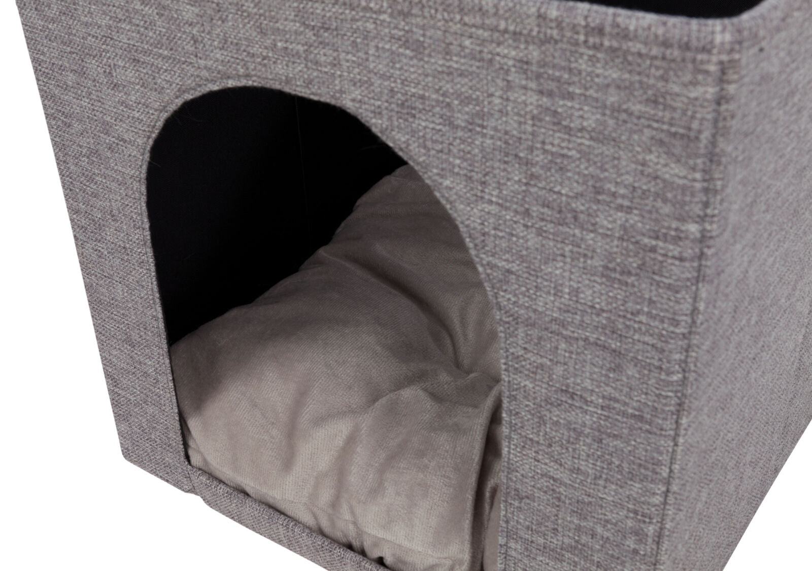 Die Trixie Kuschelhöhle Ella verwandelt Regalfächer in komfortable Schlaf- und Ruheplätze für Ihre Katze. Der graue Webstoffbezug ist robust und passt harmonisch in jedes Wohnambiente. Die faltbare Konstruktion erleichtert Handhabung und Lagerung, während das gesteppt gepolsterte Kissen mit Plüsch-Bezug für höchsten Komfort sorgt. Dank der Masse von 33 × 33 × 37 cm ist die Höhle perfekt für IKEA Kallax-Regale geeignet und bietet Ihrer Katze einen geschützten Rückzugsort.