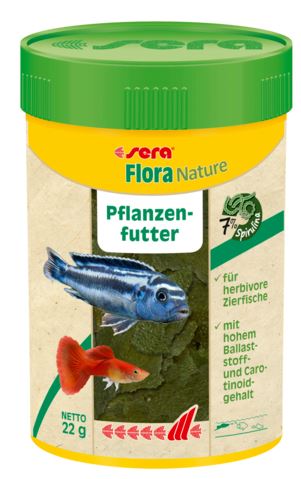 Sera Flora Nature ist ein Alleinfuttermittel für pflanzenfressende Zierfische im Süßwasseraquarium. Es sollte regelmäßig gefüttert werden, um das Wohlbefinden, die Farbenpracht und die Verdauung der Fische zu fördern.