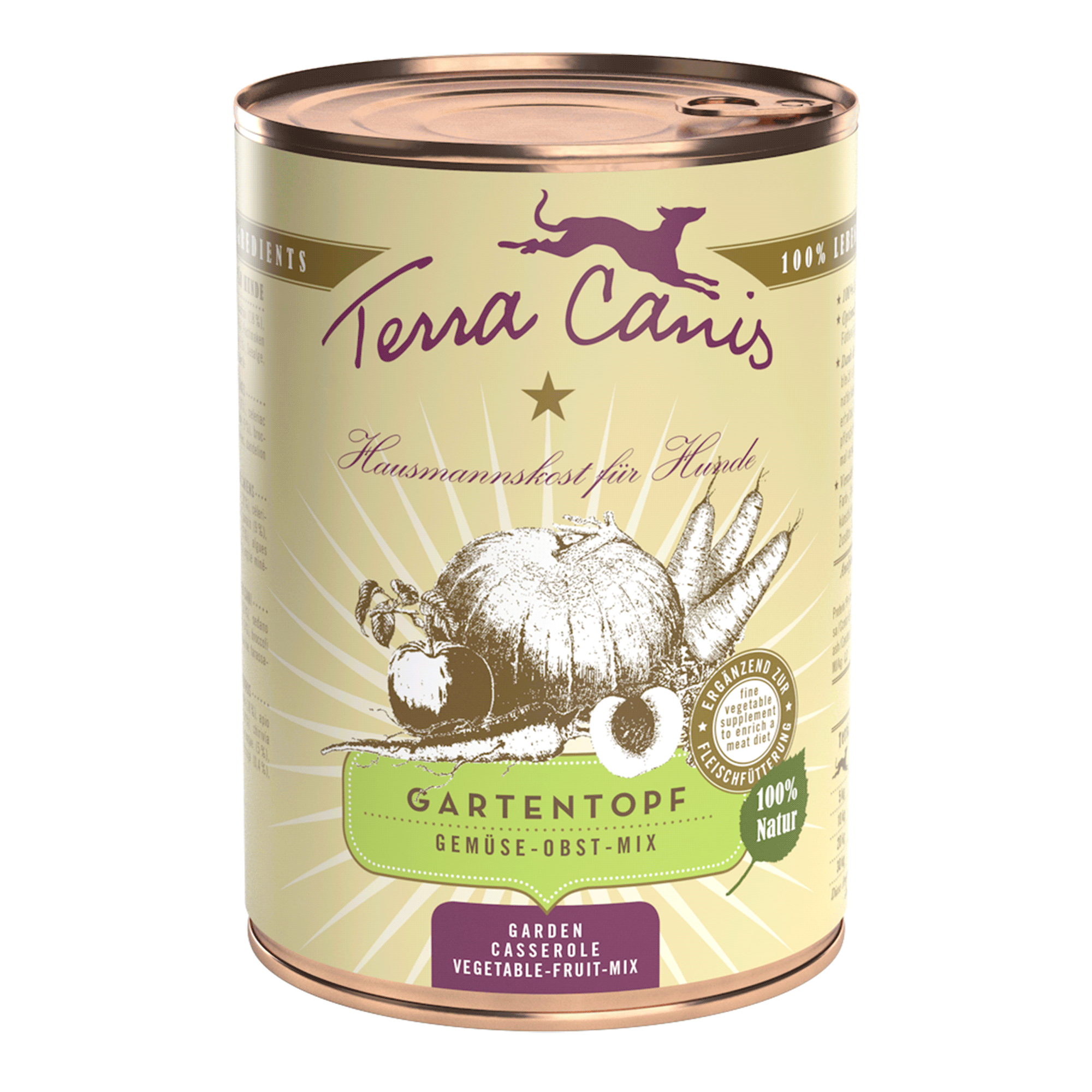 Der Terra Canis Gartentopf classic besteht aus 80 % Gemüse und 20 % Obst und ist die perfekte Ergänzung zur Ernährung Ihres Hundes, insbesondere in Kombination mit rohem oder gegartem Fleisch sowie reinen Fleischdosen. Alle Rohstoffe sind von 100 % Lebensmittelqualität. Durch das schonende Garverfahren werden die Pflanzenfasern optimal für die Verdauung aufgeschlossen und es bleiben möglichst viele natürliche Vitamine und Mineralstoffe erhalten.