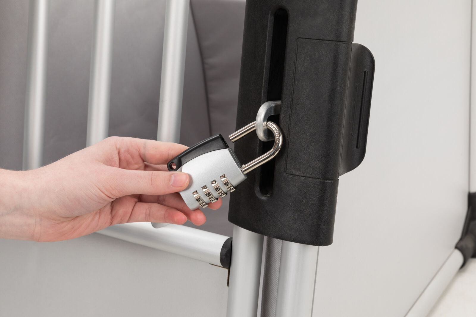 Der Aluminium-Einsatz wird an der Transportbox befestigt und ermöglicht die Nutzung eines Vorhängeschlosses, um den Zugang zum Hund während des Transports zu sichern. Besonders sinnvoll bei Fahrten mit offener Heckklappe, um unbefugtes Öffnen zu verhindern.