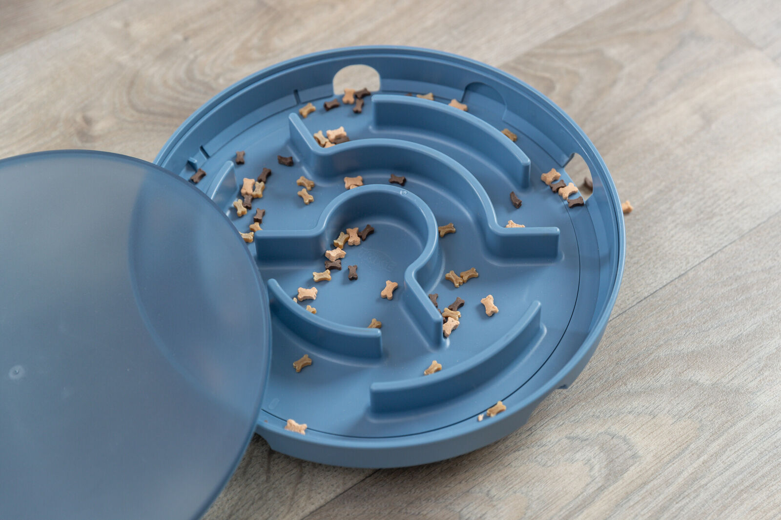 Einfach mit Trockenfutter oder Snacks befüllen. Der Hund lernt durch Bewegung und Konzentration, sich die Leckerlis zu erarbeiten – ideal zur geistigen Auslastung bei schlechtem Wetter oder im Alltag.
