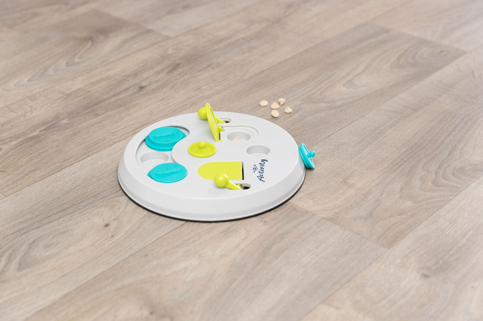 Das Flip Board sollte nur zeitlich begrenzt und unter Aufsicht angeboten werden. Nach der Fütterung sollte das Spielzeug wieder entfernt werden, um Überforderung zu vermeiden.
