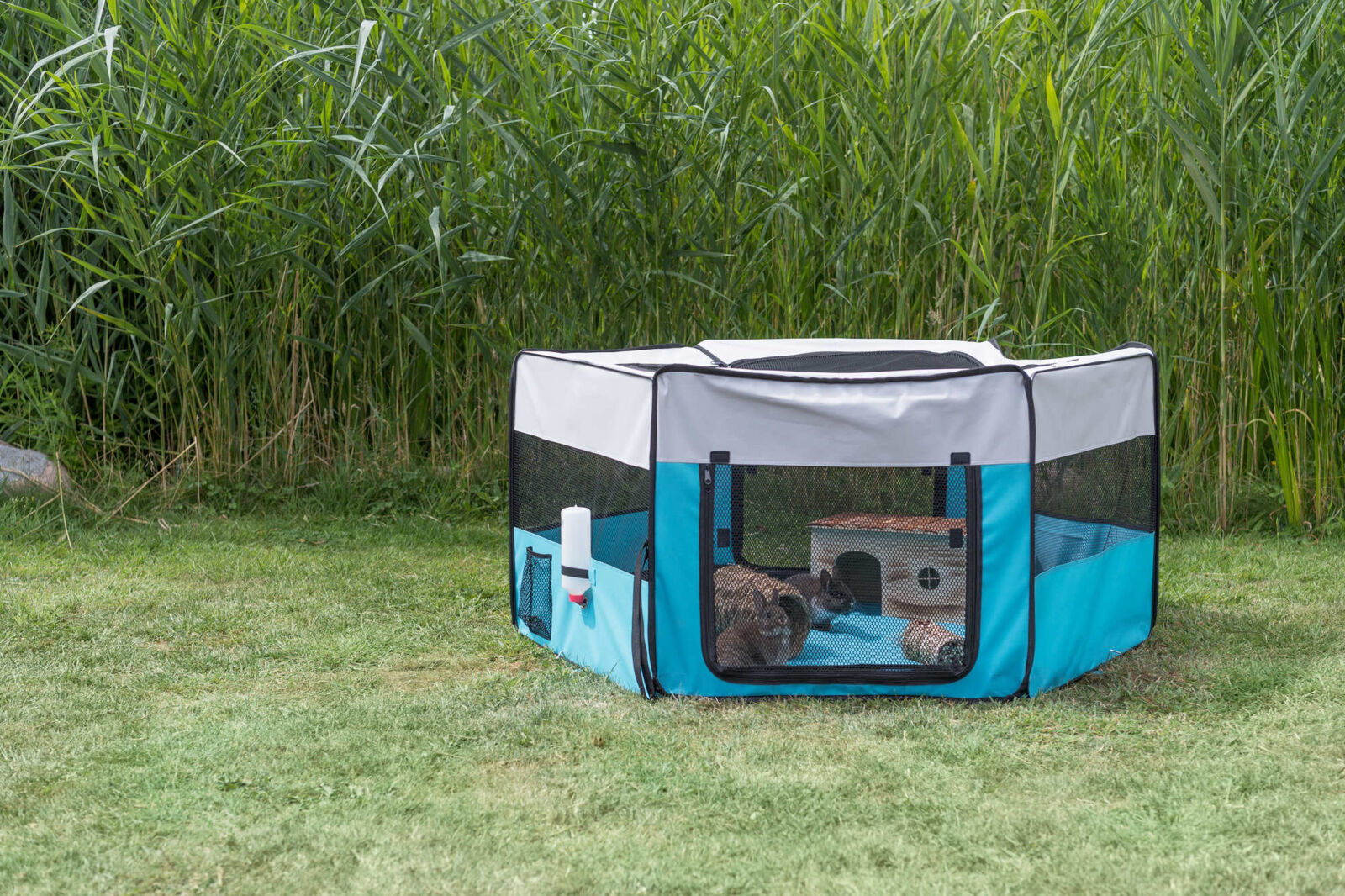 Der Trixie Freilauf mit Netz und Boden aus strapazierfähigem Polyester bietet Zwergkaninchen einen geschützten und komfortablen Auslauf im Haus oder Garten. Das Material schützt zuverlässig Kabel, Teppiche und Möbel vor dem natürlichen Nagetrieb der Nager. Die Gummierung und die erhöhten Seitenränder verhindern Verunreinigungen sowie das Eindringen von Bodennässe und Kälte. Die herausnehmbare Bodeneinlage sorgt für einfache Reinigung und zusätzlichen Komfort. Der Freilauf verfügt über eine Öffnung zur Befestigung einer Tränke und zwei praktische Seitentaschen. Mit den integrierten Schlaufen kann der Auslauf sicher fixiert werden. Das abnehmbare Netz und der Nylonboden sind waschbar und der Freilauf lässt sich zusammenfalten und platzsparend in der mitgelieferten Transporttasche verstauen.