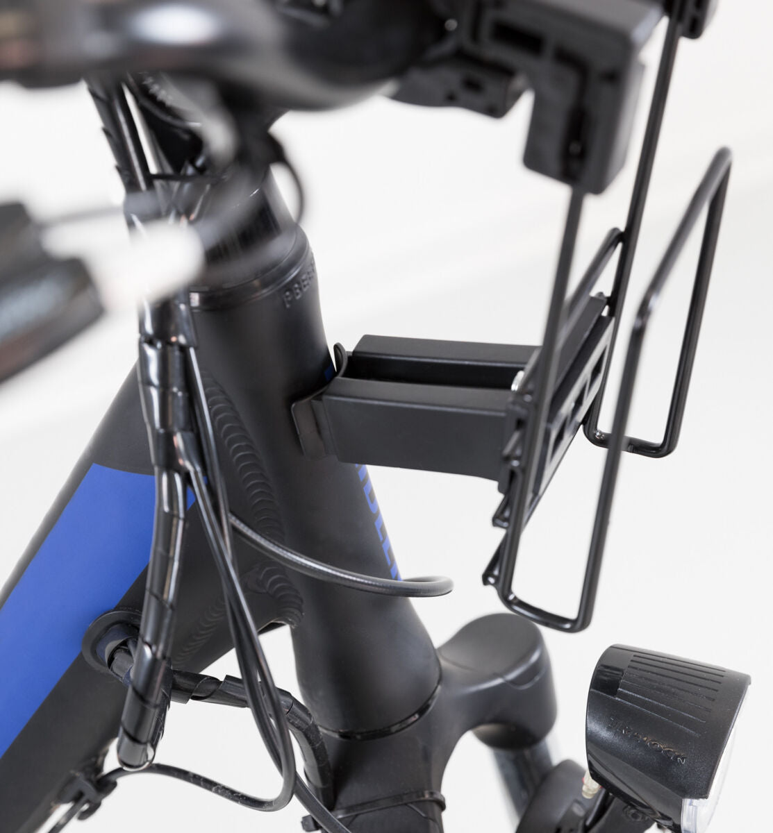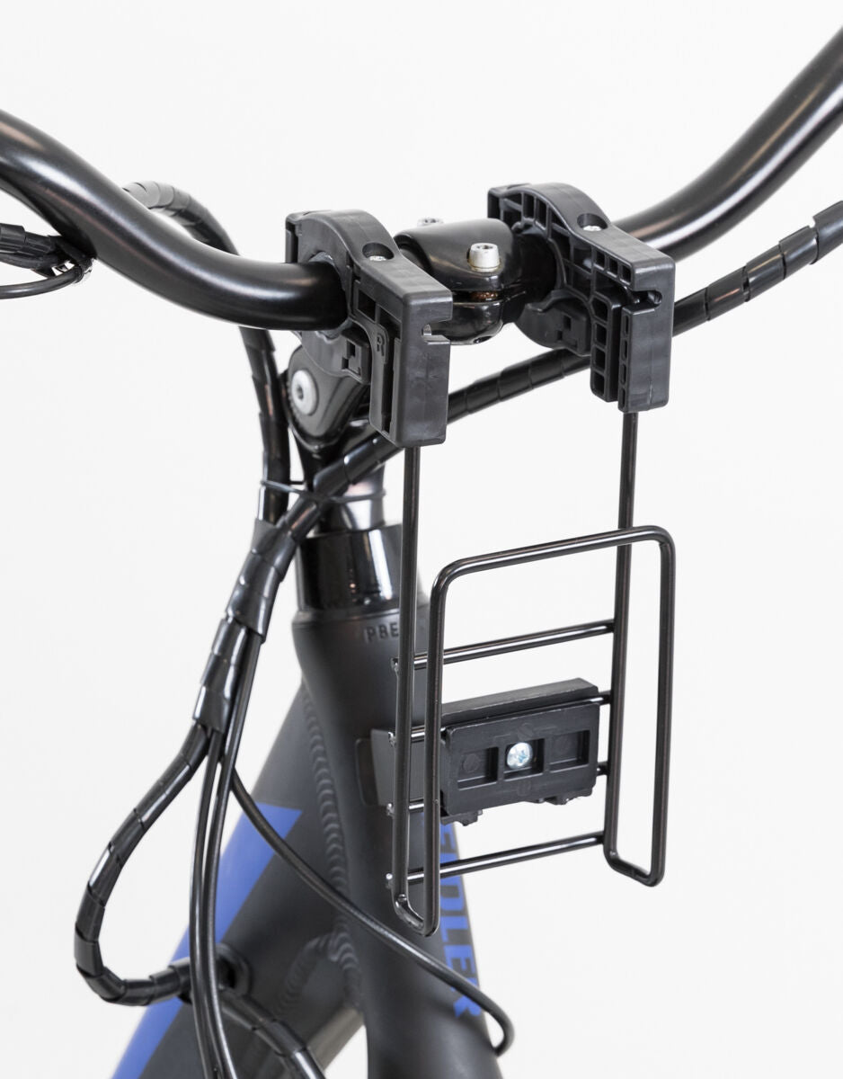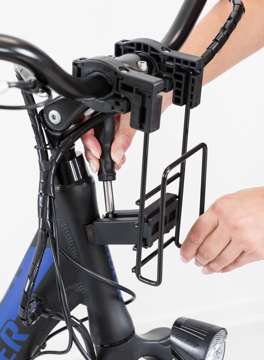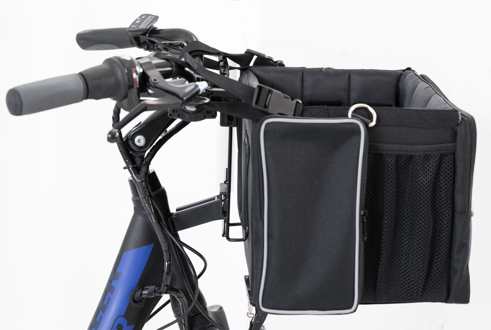 Die Front-Box wird sicher am Lenker befestigt. Der Hund wird innen mit der Kurzleine gesichert. Ideal für Fahrradtouren und Stadtwege – unterwegs auch tragbar durch den Schultergurt.