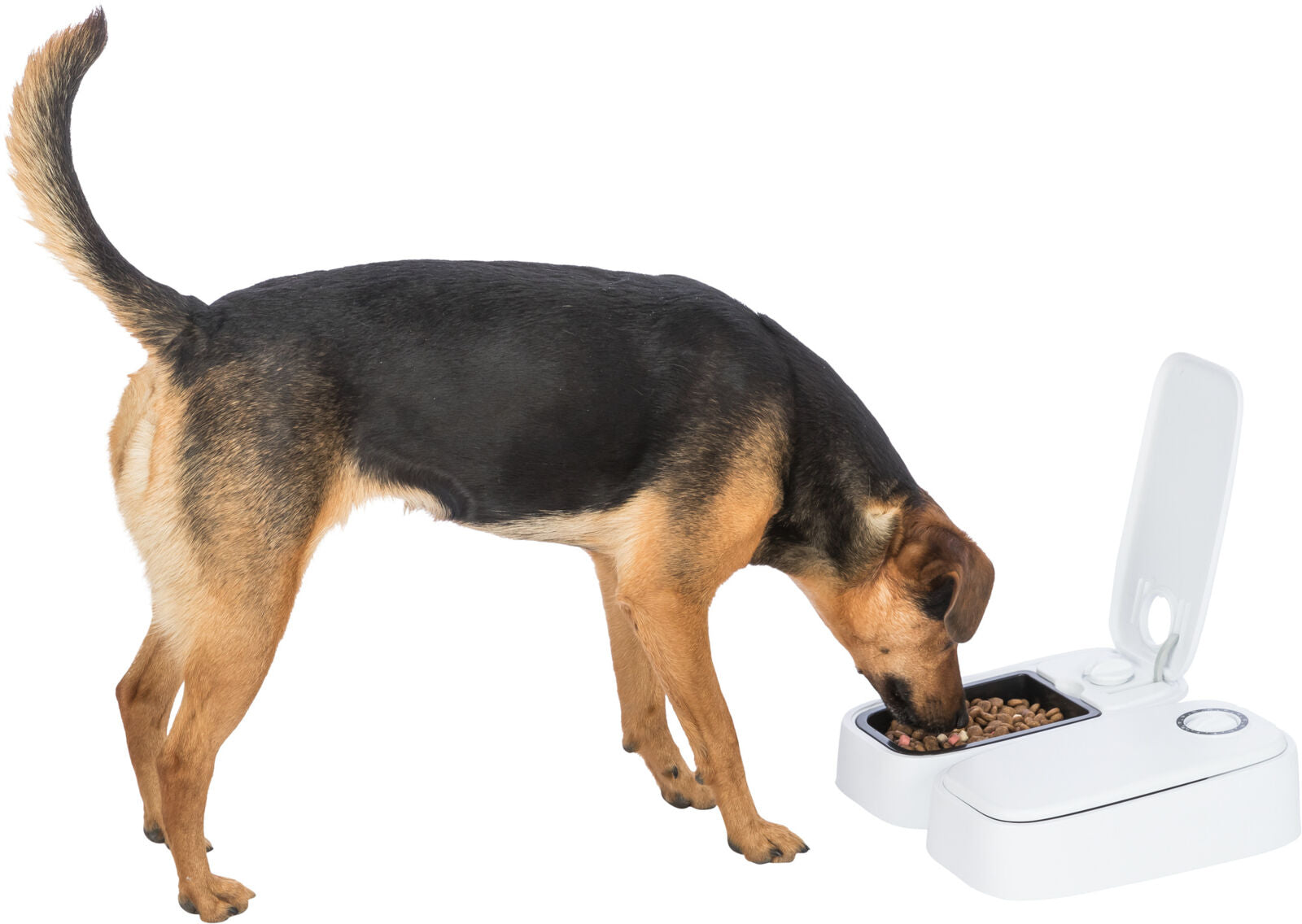 Füllen Sie die beiden Futterkammern mit dem gewünschten Futter, programmieren Sie die Fütterungszeiten und Portionen und stellen Sie den Automat an einen stabilen Ort. Regelmäßige Reinigung empfohlen.