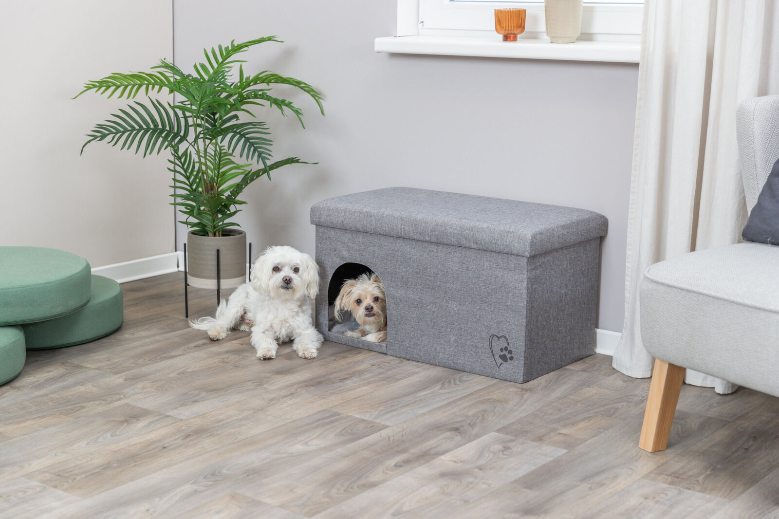 Die Trixie Kuschelhöhle Kimy bietet kleinen Hunden und grossen Katzen einen komfortablen Schlaf- und Rückzugsplatz. Der hellgraue Webstoff-/Polyesterbezug ist robust und pflegeleicht, während der faltbare Aufbau mit stabilem MDF-Rahmen für Sicherheit und Stabilität sorgt. Das abnehmbare, gepolsterte Kissen mit Plüsch-Bezug und Polyestervlies-Füllung bietet maximalen Liegekomfort. Dank des integrierten Staufachs und des Designs ist die Höhle praktisch, stylish und belastbar bis 20 kg.