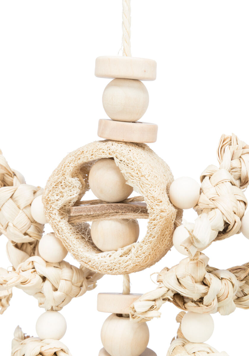 Dieses Naturspielzeug vereint verschiedene Naturmaterialien wie Bananenblätter, Holz und Luffa und bietet Vögeln eine abwechslungsreiche Beschäftigung. Es animiert zum Knabbern, Zupfen und Erkunden und fördert so artgerechtes Verhalten und mentale Auslastung. Empfohlen vom Weltvogelpark Walsrode für eine naturnahe und tiergerechte Haltung.