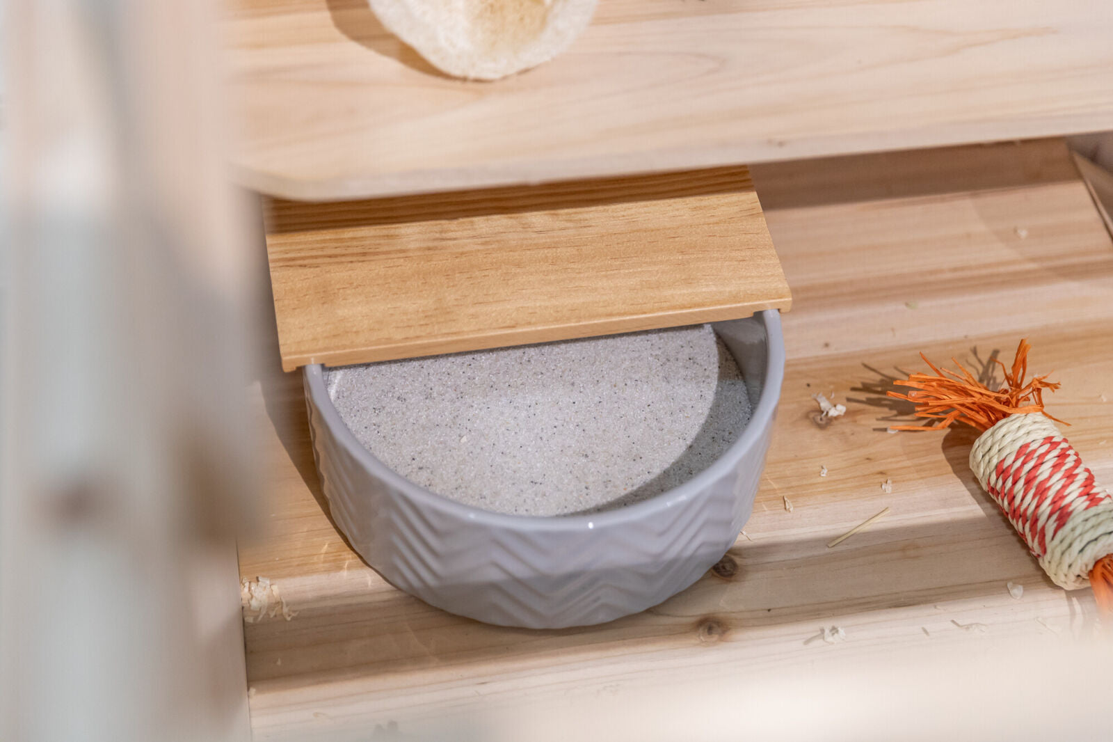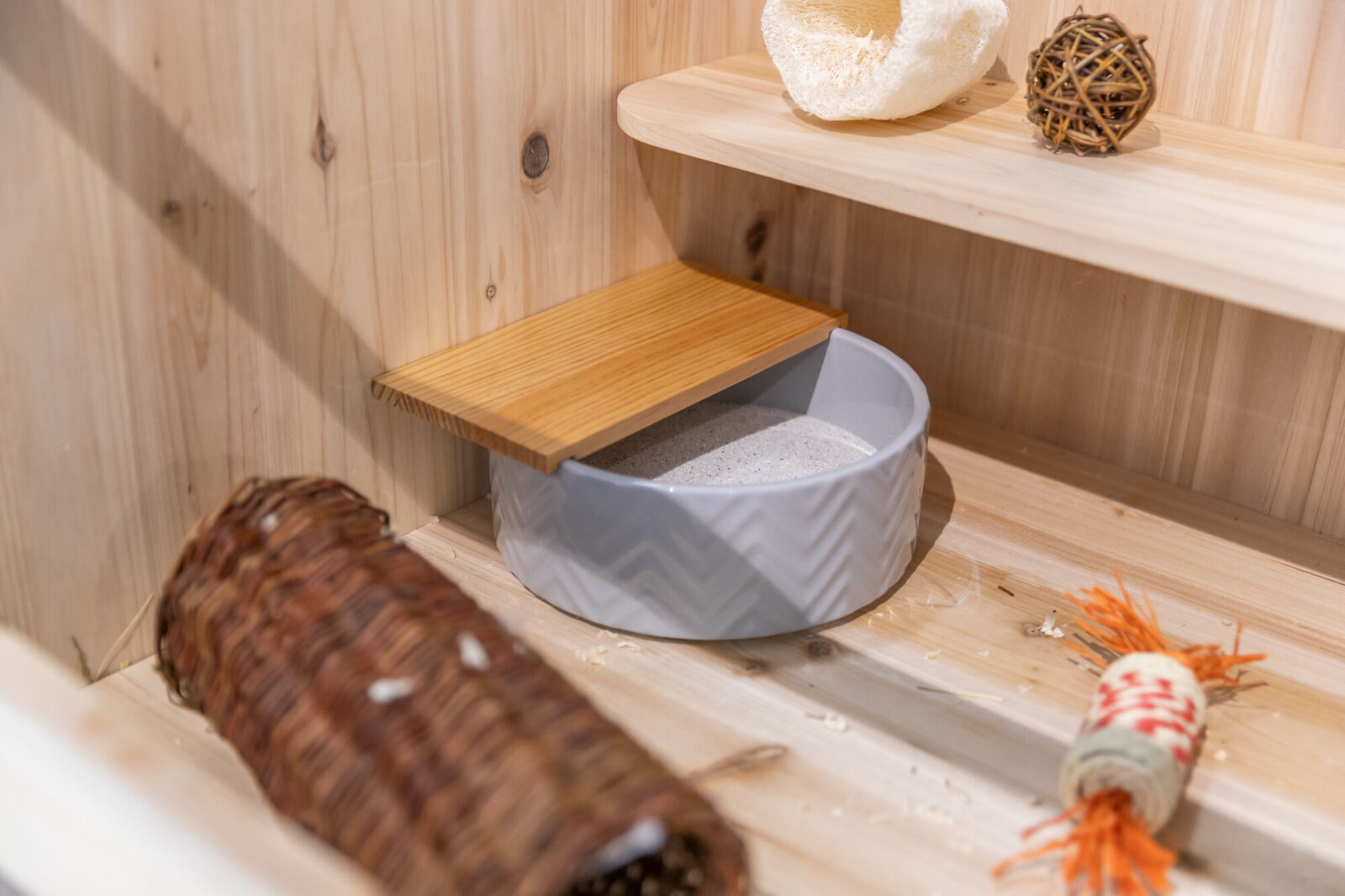 Die Keramikschale mit geeignetem Nagersand befüllen und im Gehege platzieren. Die Holzplattform dient als Einstieg und sorgt für zusätzlichen Spielspass. Sand regelmässig sieben und bei Bedarf austauschen.