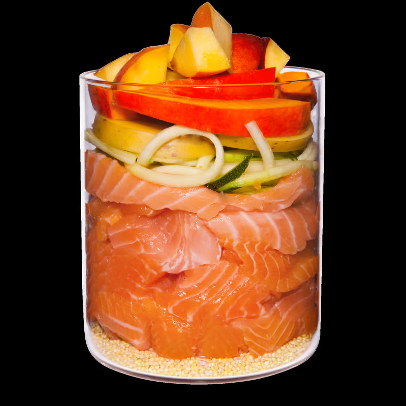 Lachs-Filet (55 %), Zucchini, Kürbis, Pfirsich (9 %), Kartoffel, Hirse (6,5 %), Rapsöl, Bierhefe*, Austernschale*, Sanddornbeere*, Fenchelsamen* (0,2 %), Thymian* (0,2 %), Dill* (0,2 %), Petersilie*, geschroteter Leinsamen, Hagebuttenpulver*, Mineralerde*, Seealge*, Mineralstoffe *getrocknet.