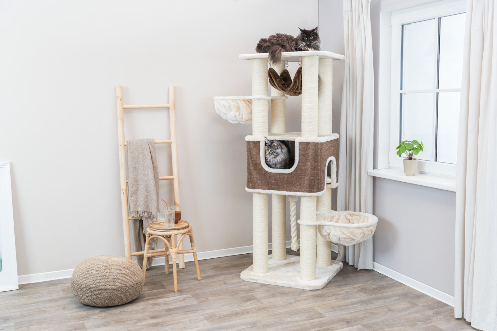 Der Trixie Kratzbaum XXL Humberto in Creme/Dunkelbraun bietet auf 174 cm Höhe besonders grossen Katzen viel Platz zum Klettern, Krallenwetzen und Entspannen. Die stabilen 6 mm Sisalstämme fördern das natürliche Kratzverhalten. Die Höhle mit Plüsch/Fleece und Wendekissen, zwei gepolsterte Kuschelsäcke sowie die abnehmbare, gepolsterte Hängematte schaffen gemütliche Rückzugsorte. Die dicke, schwere Bodenplatte sorgt für optimale Stabilität und Sicherheit.