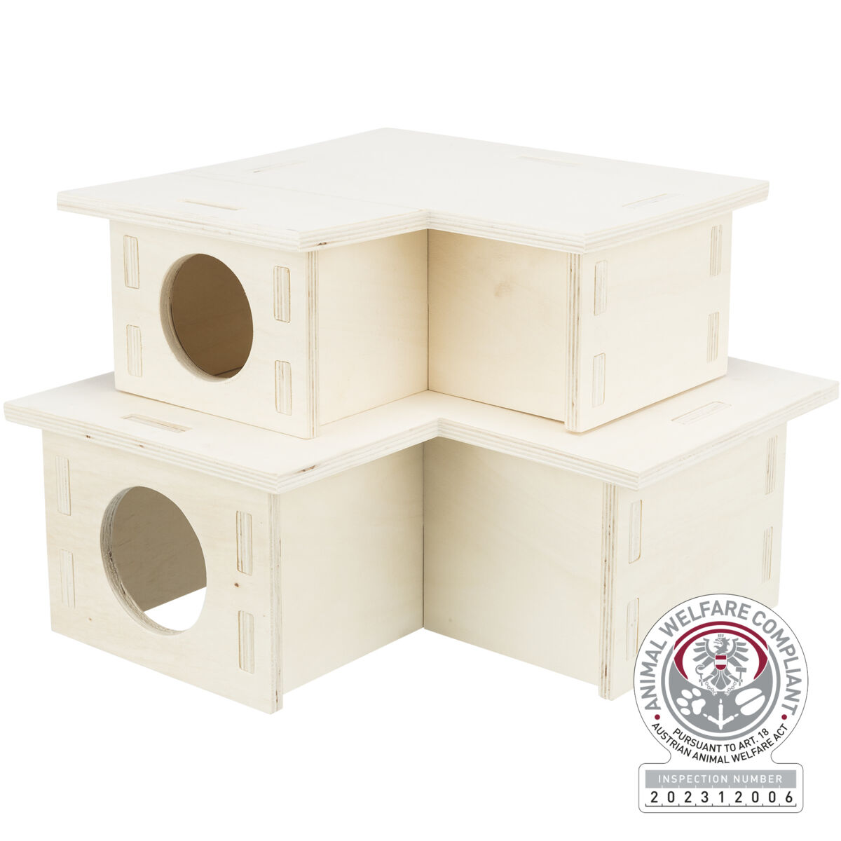 Das Trixie Mehrkammerhaus bietet kleinen Nagetieren wie Meerschweinchen oder Kaninchen ein grosszügiges und artgerechtes Zuhause mit drei separaten Kammern. Das durchdachte Kammersystem erlaubt es den Tieren, sich zurückzuziehen oder gemeinsam zu verweilen. Gefertigt aus unbehandeltem FSC-zertifiziertem Holz ist das Haus besonders nachhaltig. Dank des praktischen Stecksystems lässt sich das Haus einfach und stabil montieren – ganz ohne Nägel oder Nieten. Geprüft durch unabhängige Fachstellen erfüllt es hohe Standards für tiergerechte Haltung und Tierschutz.