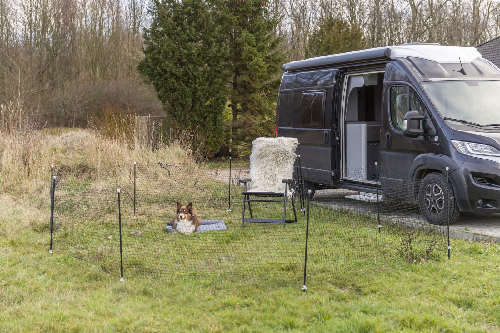 Der Zaun wird einfach auf der gewünschten Fläche aufgestellt, die Stangen in den Boden gesteckt und das Netz mit den Halteclips fixiert. So kann der Hund sicher innerhalb eines abgegrenzten Bereiches spielen oder ruhen.