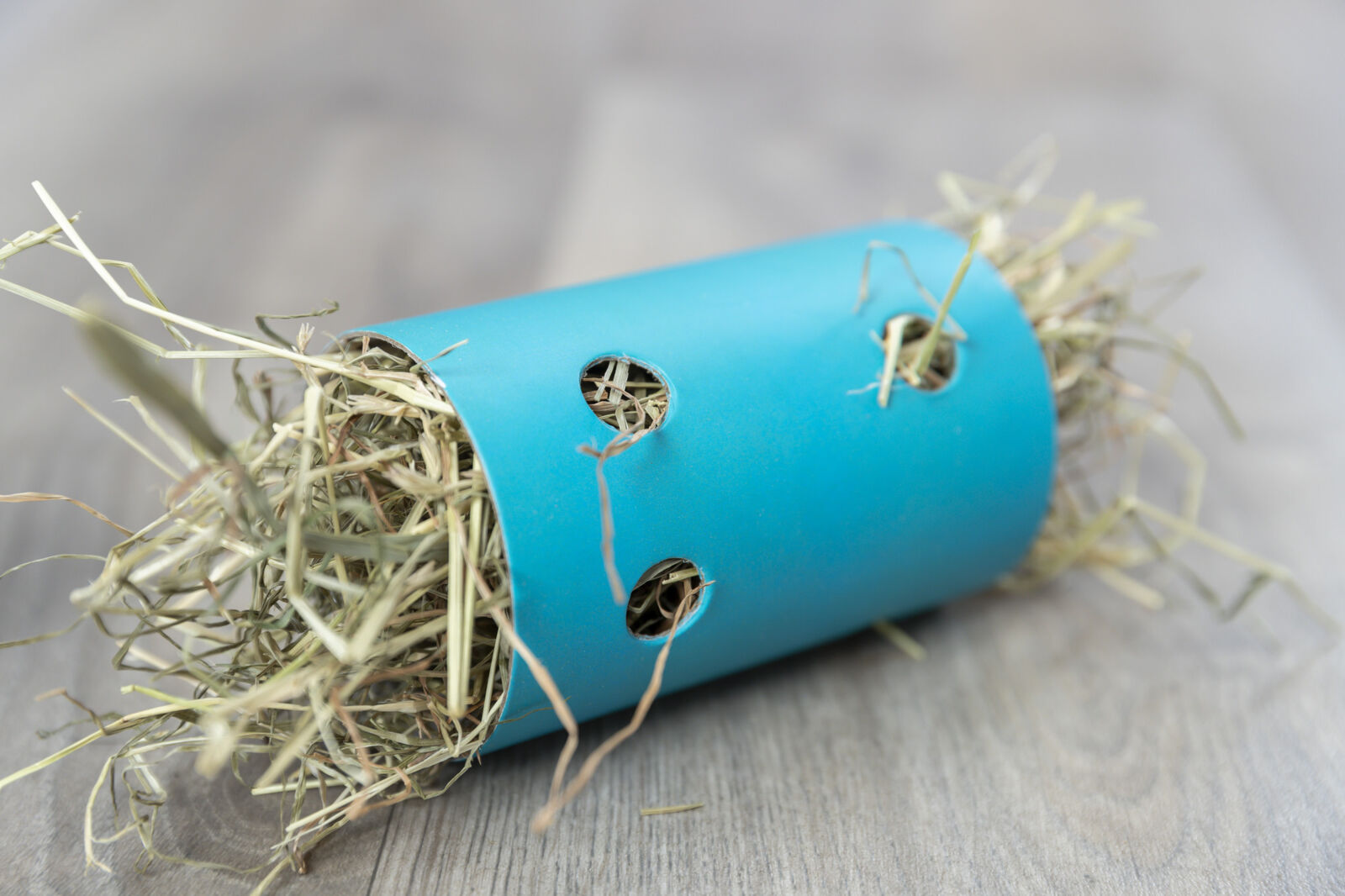 Rolle mit Leckerlis oder Trockenfutter befüllen und dem Tier zum Spielen anbieten.