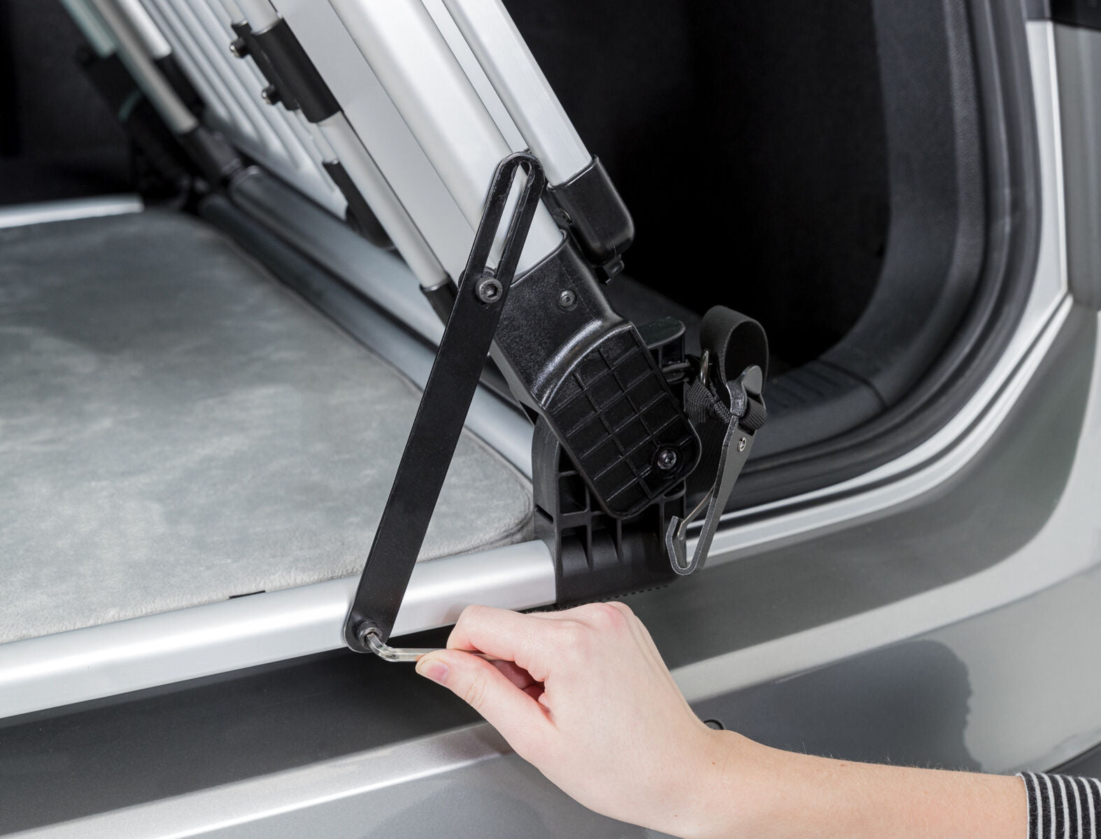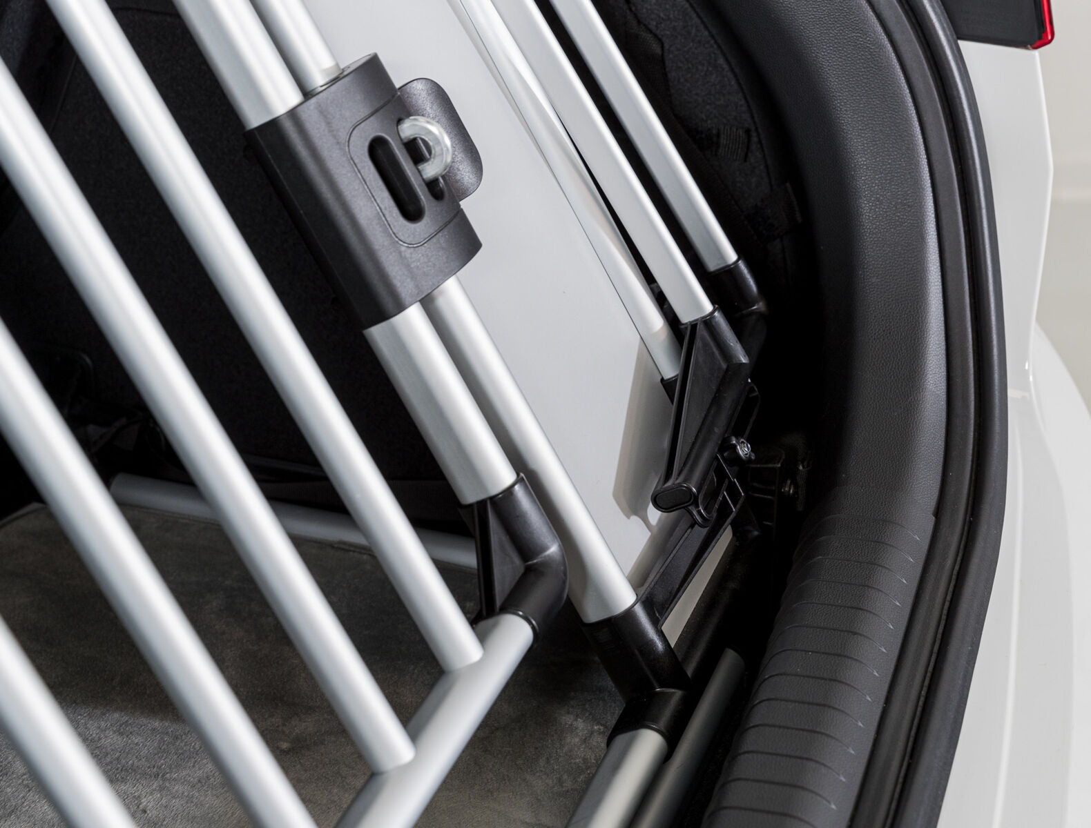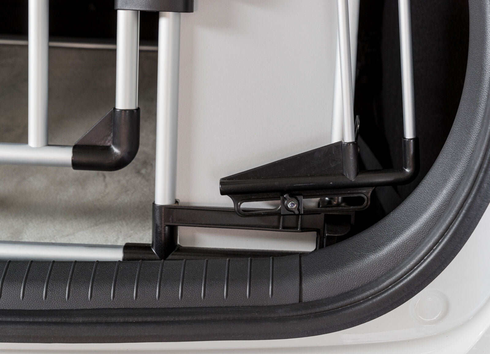 Das Heckgitter wird mit dem Spannmechanismus zwischen Boden und Dach des Fahrzeugs eingespannt. Breite und Höhe lassen sich je nach Fahrzeugmodell anpassen. Kein Bohren erforderlich – rückstandslos entfernbar.