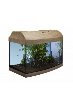 Das Aquarium besteht aus robustem Sicherheitsglas, kombiniert mit einem MDF-Unterschrank in Buche-Optik. Das Set beinhaltet eine LED-Beleuchtung sowie ein integriertes Filtersystem.