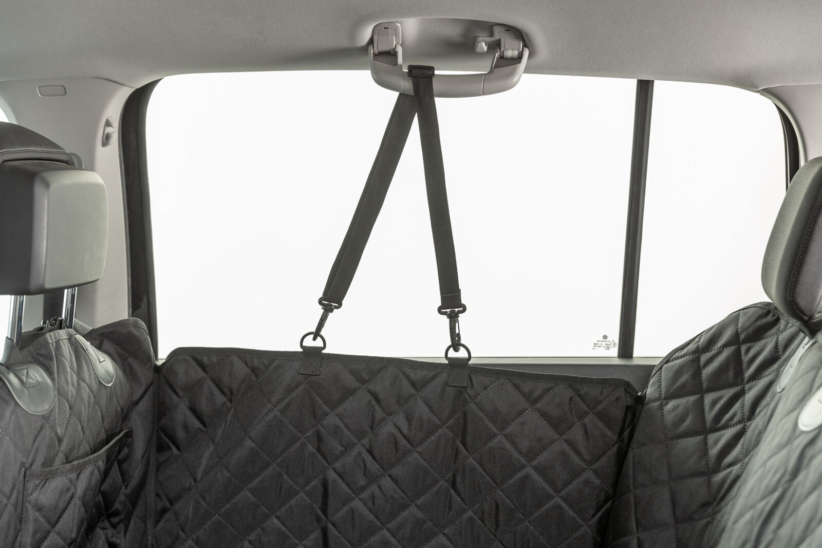 Die Auto-Schondecke wird auf der Rückbank ausgelegt und mit den Platten ausgefahren, um die Liegefläche zu vergrössern. Seitenteile können zum Ein- und Aussteigen geöffnet werden. Der Hund kann sicher angeschnallt werden, während die rutschfeste Unterseite die Decke an Ort und Stelle hält und Polster vor Verschmutzungen schützt.