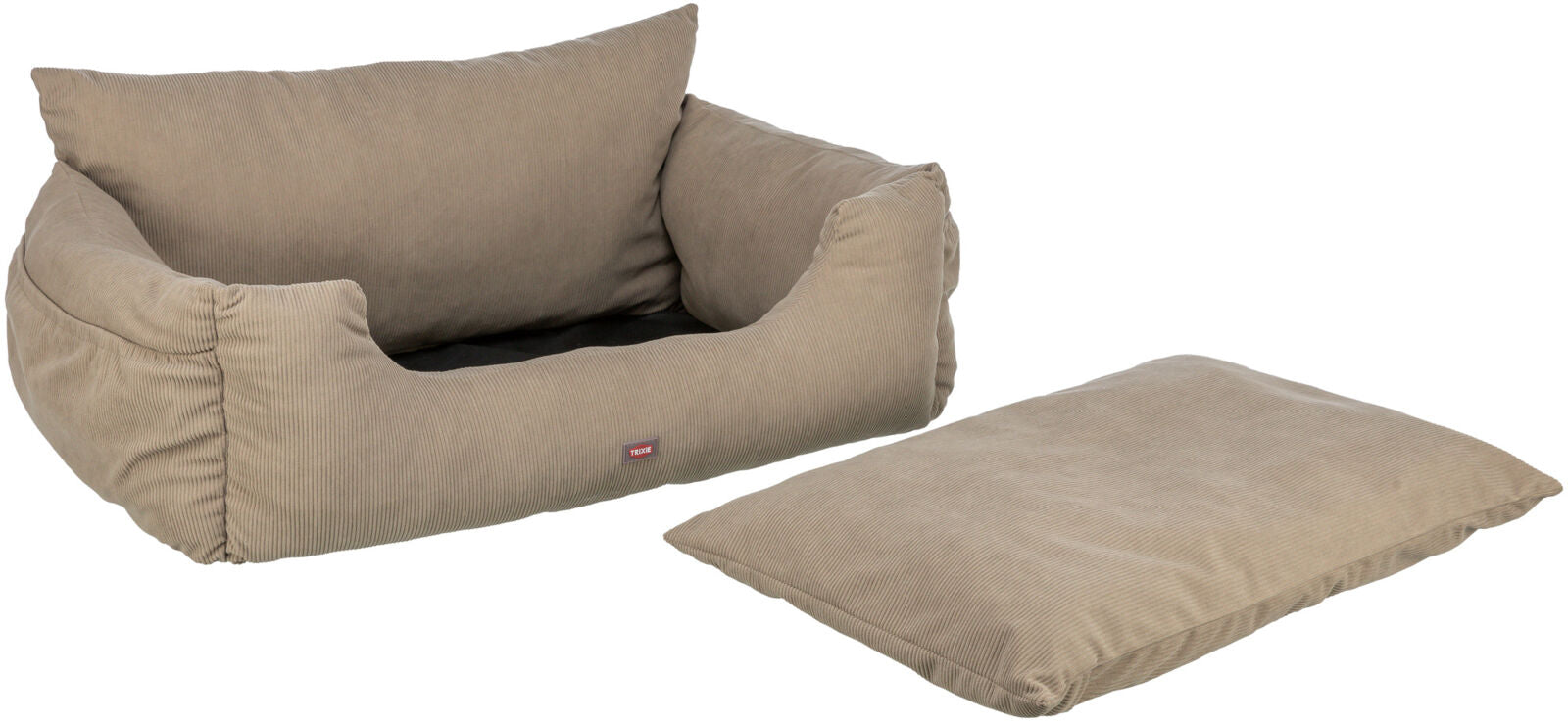 Der Trixie Autositz in taupe bietet zwei kleinen Hunden einen gemütlichen und sicheren Platz im Fahrzeug. Er ist weich gepolstert und dank Cord-Optik aus Polyester besonders komfortabel. Mit Befestigungsgurten lässt sich der Sitz sicher im Auto fixieren. Gurtdurchführungen ermöglichen das Anschnallen der Hunde für maximale Sicherheit. Das herausnehmbare Kissen sorgt für einfache Reinigung. Aussentaschen bieten praktischen Stauraum für Leckerlis oder Zubehör. Der rutschfeste Boden sorgt dafür, dass der Sitz auch während der Fahrt sicher an seinem Platz bleibt. Zusätzlich kann der Autositz auch als Reisebettchen genutzt werden.