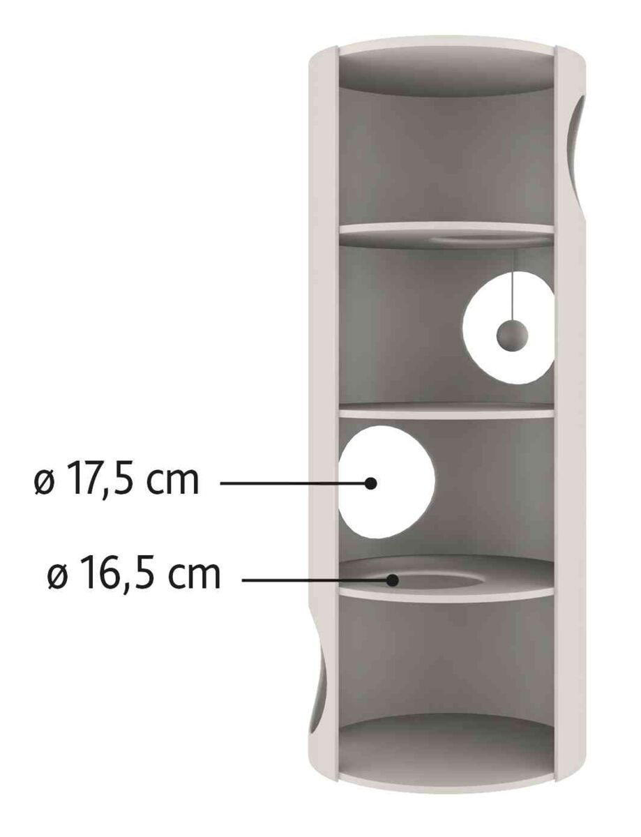 Der Cat Tower wird in der Wohnung aufgestellt und bietet Katzen vielfältige Beschäftigungsmöglichkeiten sowie komfortable Ruheplätze. Regelmässige Reinigung der Plüschflächen empfohlen.