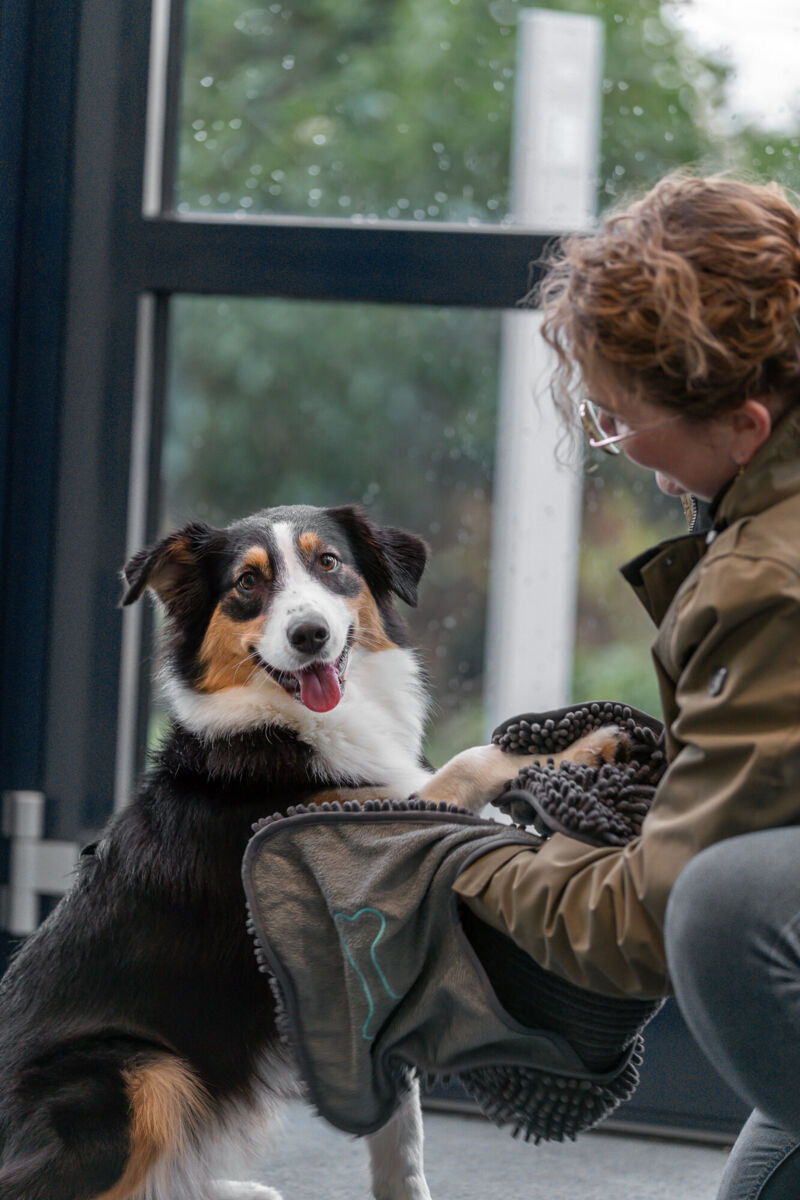 Einfach mit beiden Händen in die Laschen schlüpfen und das Tier gründlich abtrocknen. Nach Gebrauch auslüften oder bei Bedarf waschen.