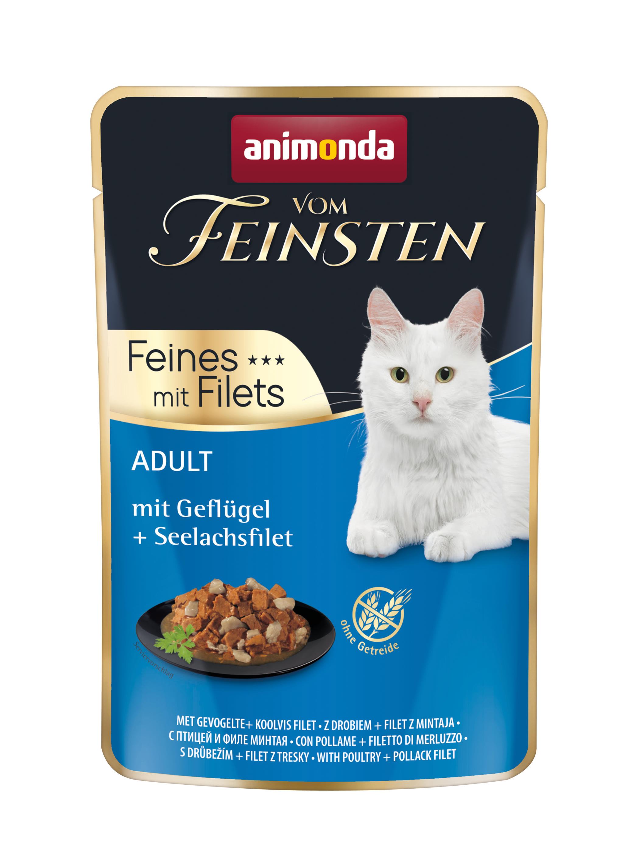 Animonda Vom Feinsten Adult Frischebeutel Geflügel + Seelachsfilet ist eine vollwertige Mahlzeit, die sich ideal für die tägliche Ernährung ausgewachsener Katzen eignet.