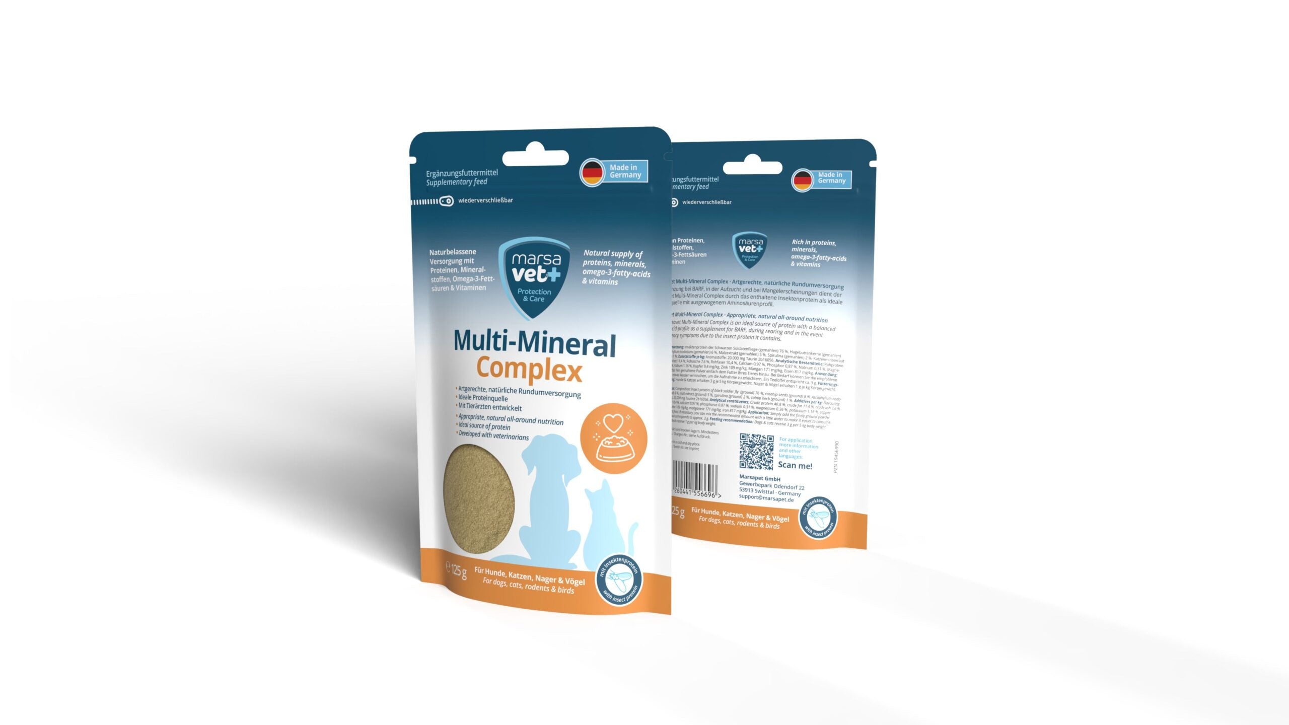 Der MarsaVet Multi-Mineral Complex bietet eine hochwertige Ergänzung zur täglichen Fütterung Ihres Haustiers – egal ob Hund, Katze, Vogel oder Nager. Mit natürlichen Inhaltsstoffen wie Insektenprotein und wertvollen Pflanzenextrakten wurde die Rezeptur in Zusammenarbeit mit Tierärzten entwickelt, um gezielt bei Mangelernährung, erhöhtem Nährstoffbedarf oder zur Unterstützung in Regenerationsphasen zu helfen. Das Pulver ist besonders geeignet für BARF-Fütterung und liefert eine optimale Versorgung mit Vitaminen, Mineralstoffen, Spurenelementen, Omega-3-Fettsäuren und Aminosäuren.