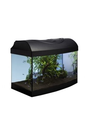 Das Aquarium besteht aus robustem Sicherheitsglas mit gebogener Frontscheibe und einem MDF-Unterschrank in mattem Schwarz. Im Set enthalten sind eine LED-Beleuchtung und ein integriertes Filtersystem.
