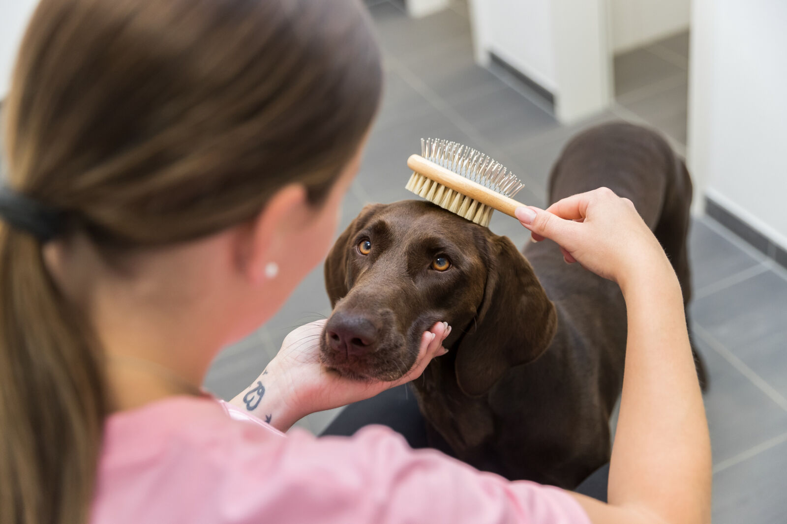 Mit sanftem Druck in Fellwuchsrichtung bürsten. Zuerst die Metallborsten zum Lösen von Verfilzungen oder Unterwolle verwenden, anschließend mit der Naturborstenseite das Fell glätten und pflegen.
