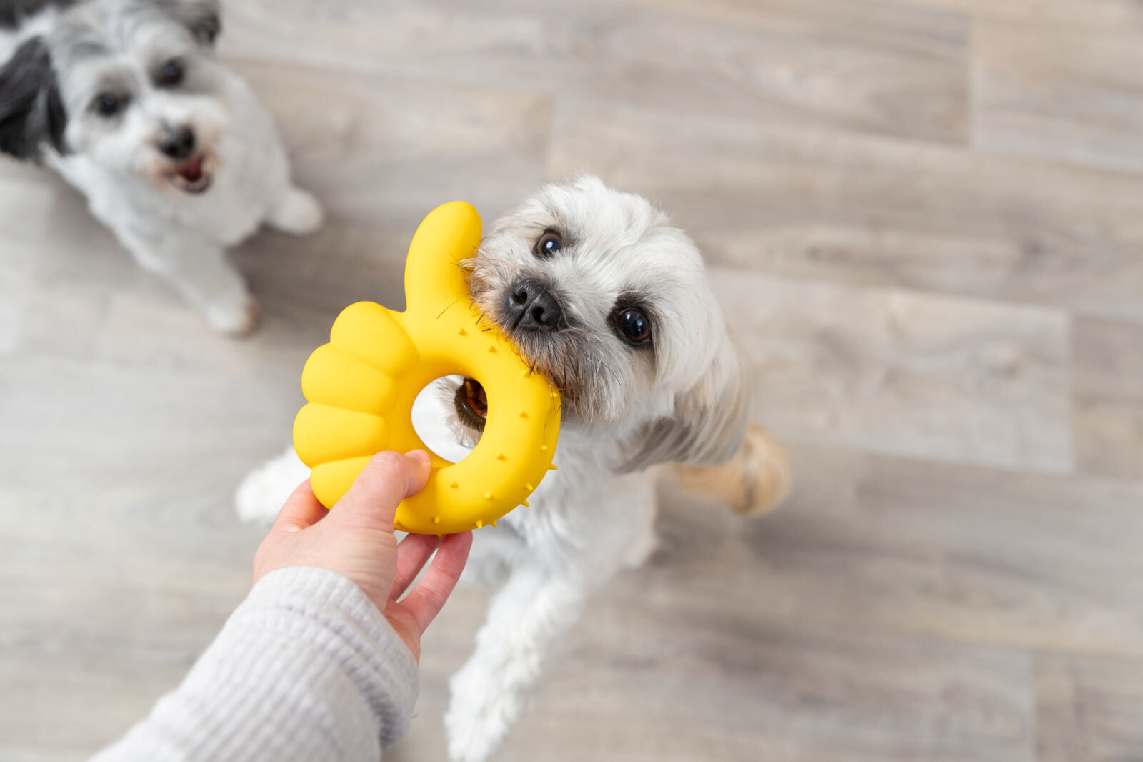 Der Latex-Daumen eignet sich für interaktives Spielen, Kauen und Apportieren. Die eingebaute Stimme sorgt für zusätzliche Motivation. Das Spielzeug sollte regelmäßig auf Schäden geprüft und bei Bedarf ersetzt werden.