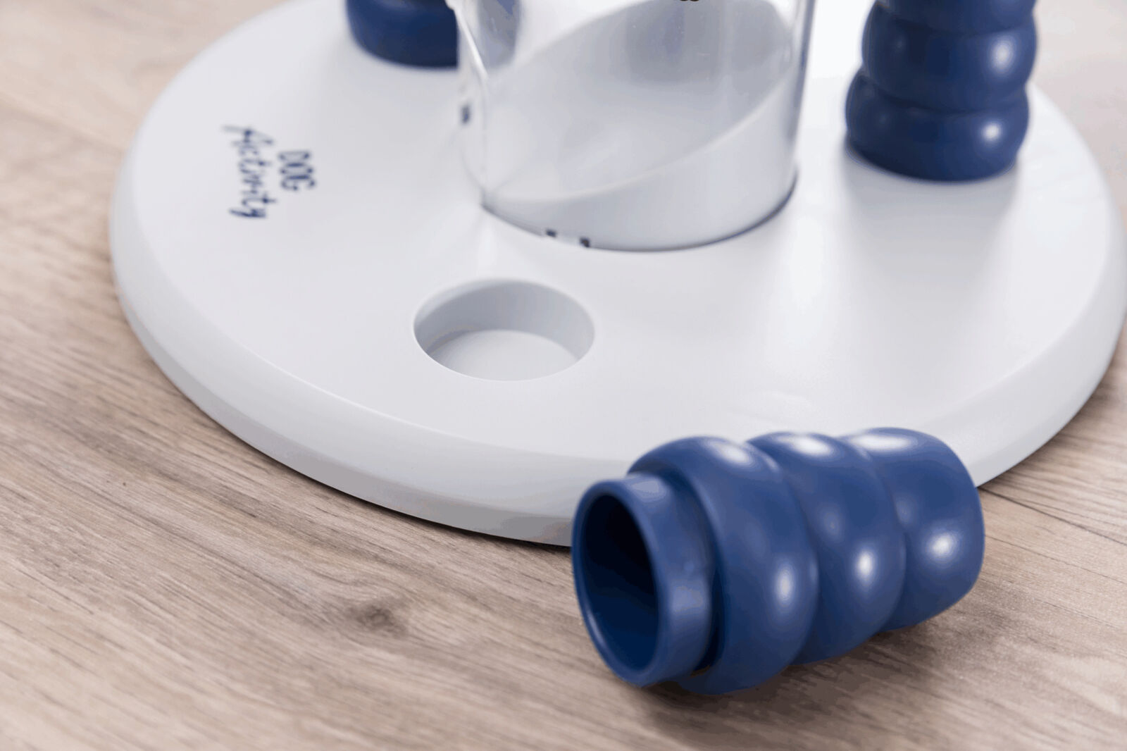 Der Hund muss die Kegel entfernen und die Einschübe mit Pfote oder Schnauze herausziehen, um an die versteckten Leckerlis zu gelangen. Das Spiel trainiert die Geduld, Koordination und die geistige Ausdauer Ihres Hundes.