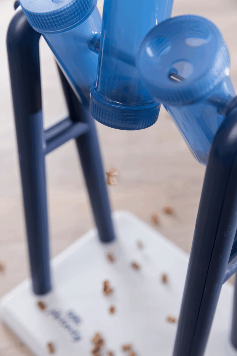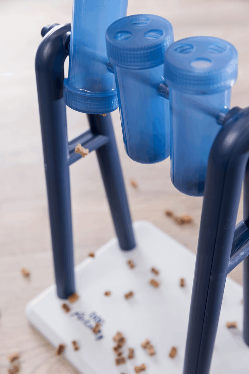 Der Hund dreht an den Elementen, um die Deckel mit unterschiedlich grossen Öffnungen zu öffnen und so an die versteckten Leckerlis zu gelangen. Die verschiedenen Schwierigkeitsstufen sorgen für eine abgestufte Herausforderung und trainieren die geistige Ausdauer sowie das Geschick des Hundes.