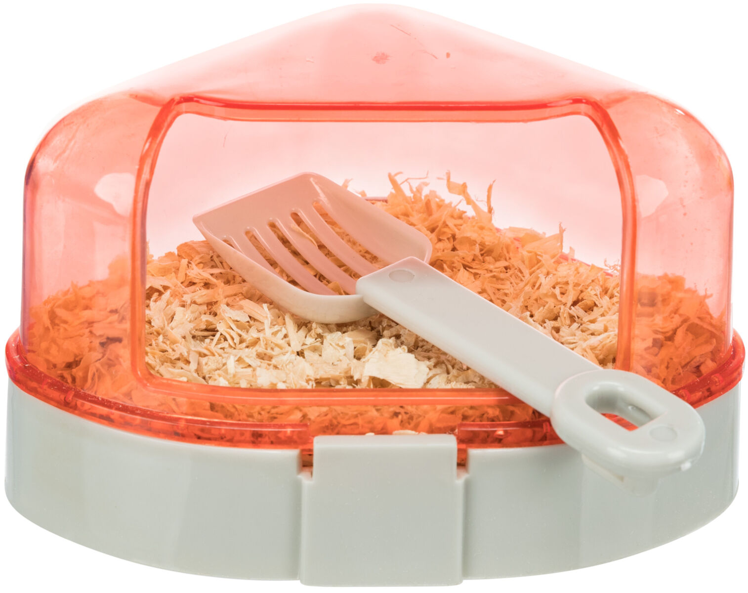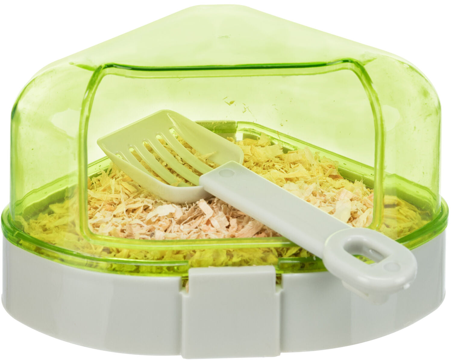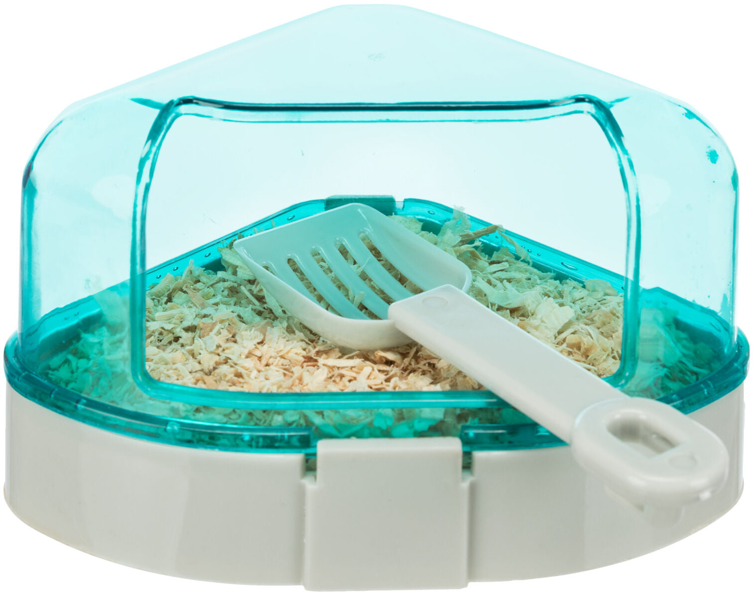 Die Toilette wird in eine Ecke des Hamsterkäfigs gestellt und bei Bedarf gereinigt. Das Dach kann abgenommen werden, um die Reinigung zu erleichtern und den Hamsterkomfort zu erhöhen.