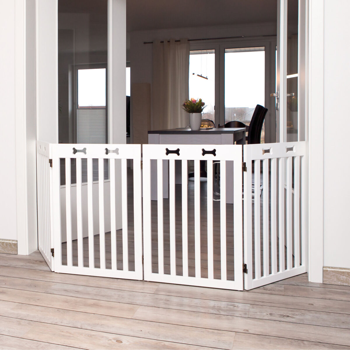 Description Trixie - Hunde-Absperrgitter, 4-teilig, weiss: Flexibler Schutz für grosse Hunde
