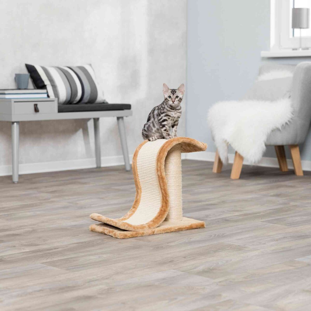Die Sisal-Kratzwelle wird an geeigneter Stelle befestigt und dient als natürliche Kratzfläche für Katzen. Regelmäßige Kontrolle und Reinigung empfohlen.