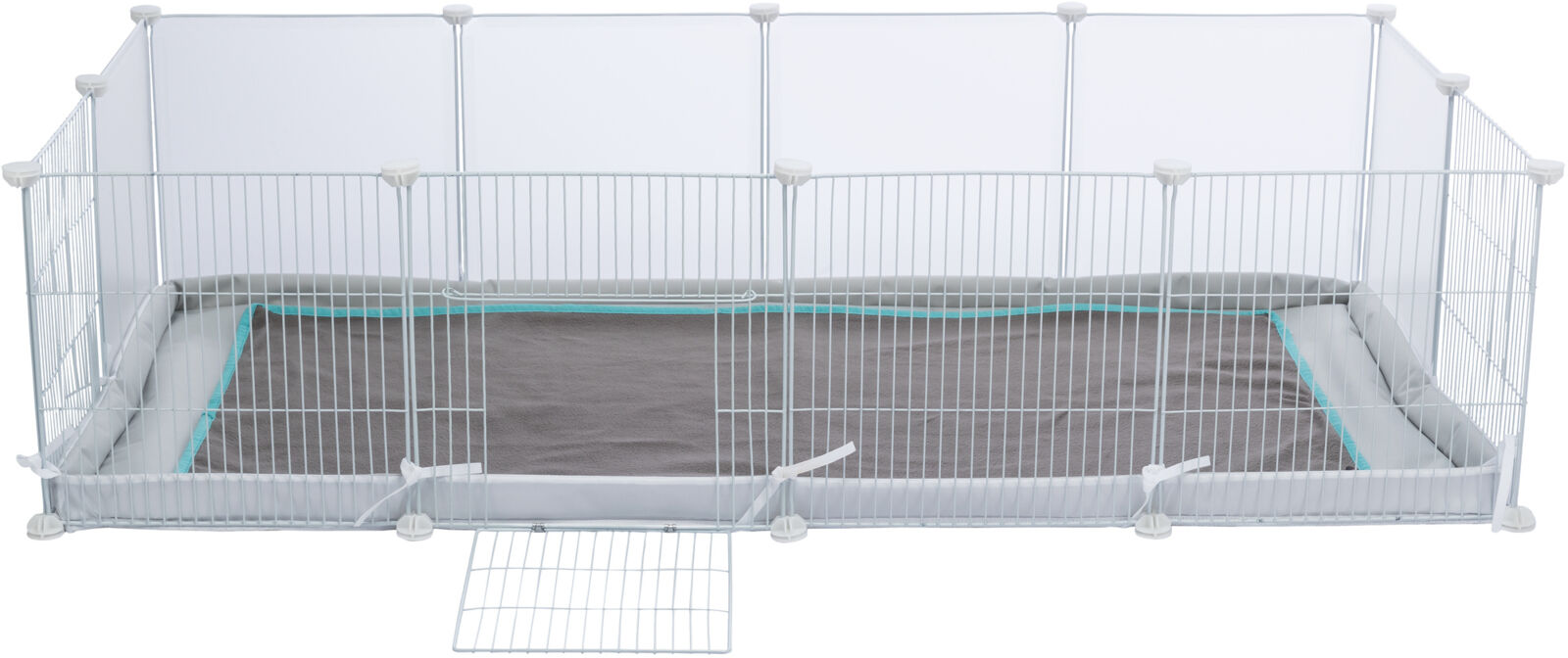 Das Gehege lässt sich durch einfaches Zusammenstecken der 12 Elemente individuell aufstellen. Für Kaninchen wird empfohlen, das Set mit mindestens einem weiteren Gehege zu kombinieren. Der Einsatz dient nicht nur als Auslauf, sondern auch als praktischer Schutz vor ungewolltem Nagen an Möbeln oder Kabeln.