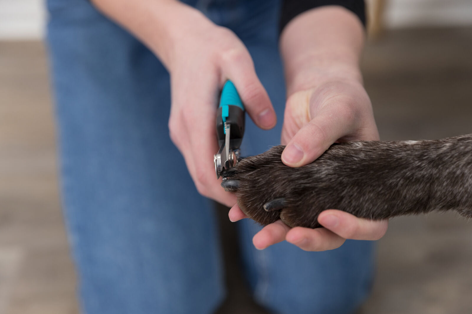 Die Krallenschere wird sorgfältig an der Spitze der Kralle angesetzt, um den überstehenden Teil vorsichtig abzutrennen. Regelmäßiges Kürzen verhindert ein Einwachsen und beugt Verletzungen vor.