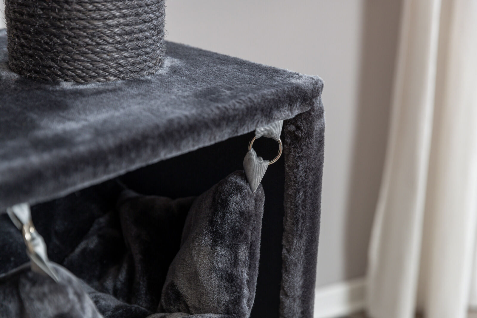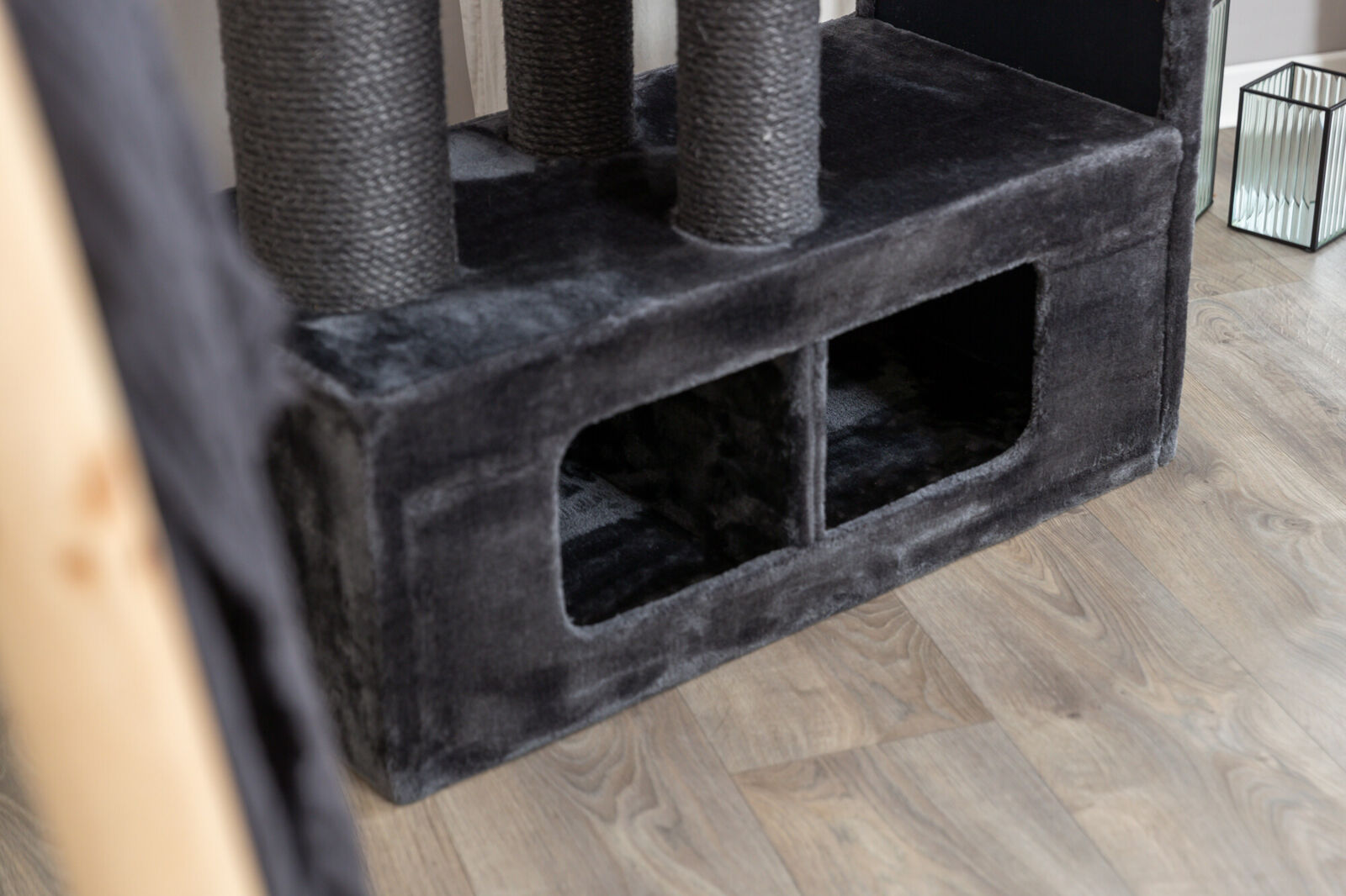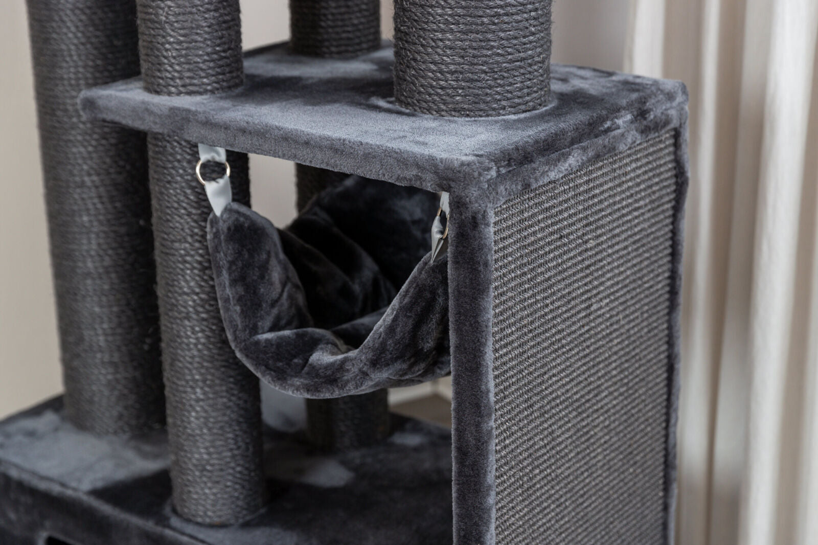 Der Trixie Kratzbaum Antonio in Anthrazit bietet Katzen auf 167 cm Höhe vielfältige Möglichkeiten zum Klettern, Kratzen und Ausruhen. Aus robustem Sisal und weichem Plüsch gefertigt, verfügt er über eine Seitenwand mit grosser Sisalkratzfläche, eine Höhle (optional mit Trennwand), ein Kuschelbett mit gestepptem Kissen und eine abnehmbare, gepolsterte Hängematte. Alle Textilien sind für Handwäsche geeignet. Dieser Kratzbaum kombiniert Komfort, Spielspass und Rückzugsmöglichkeiten für aktive Katzen.