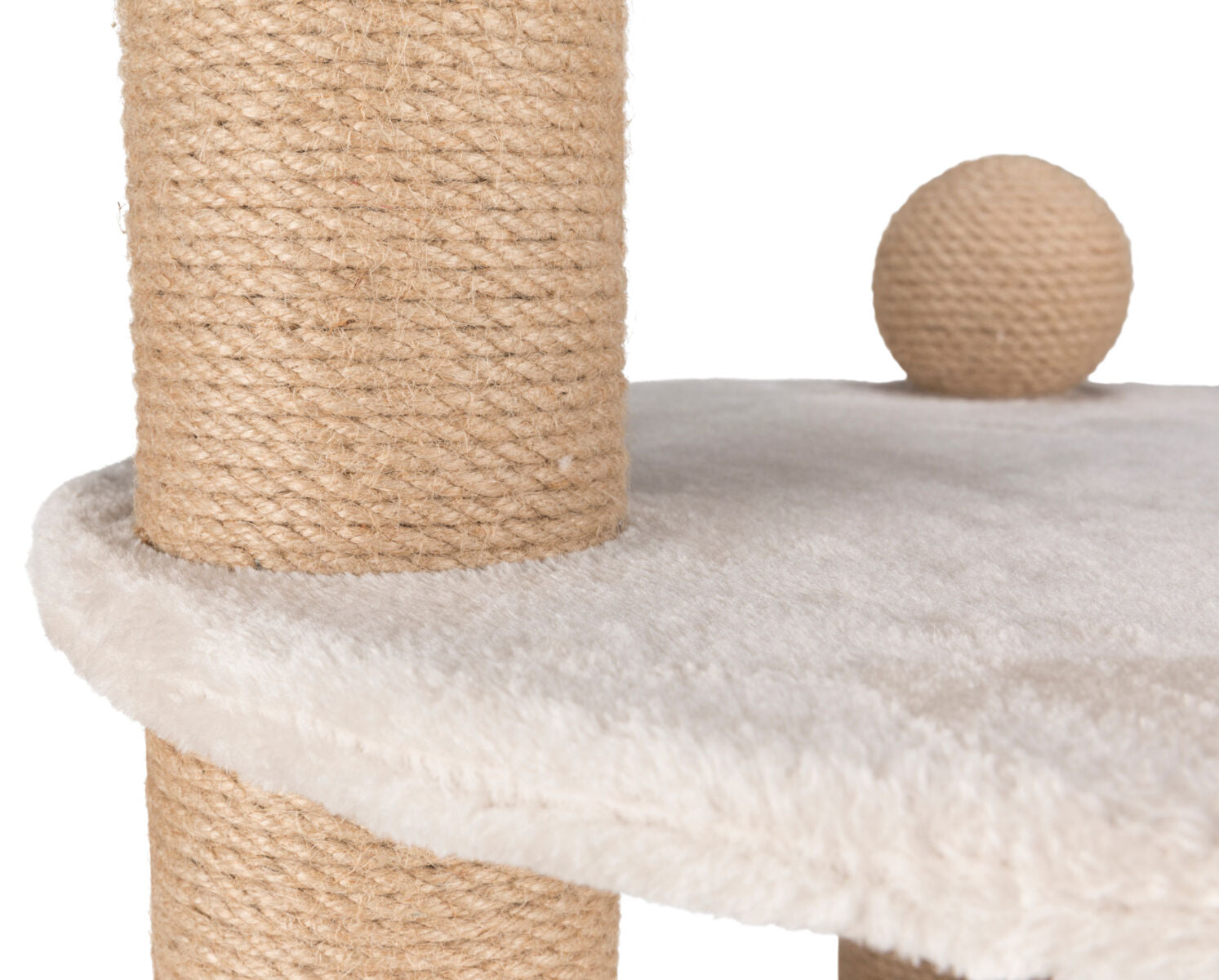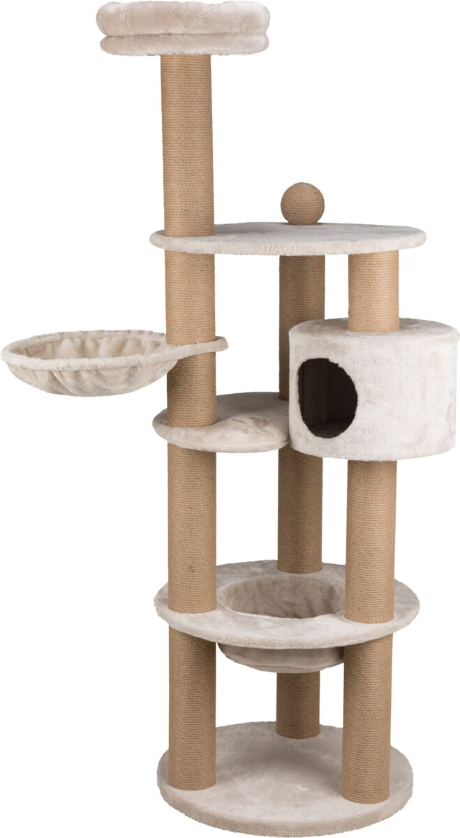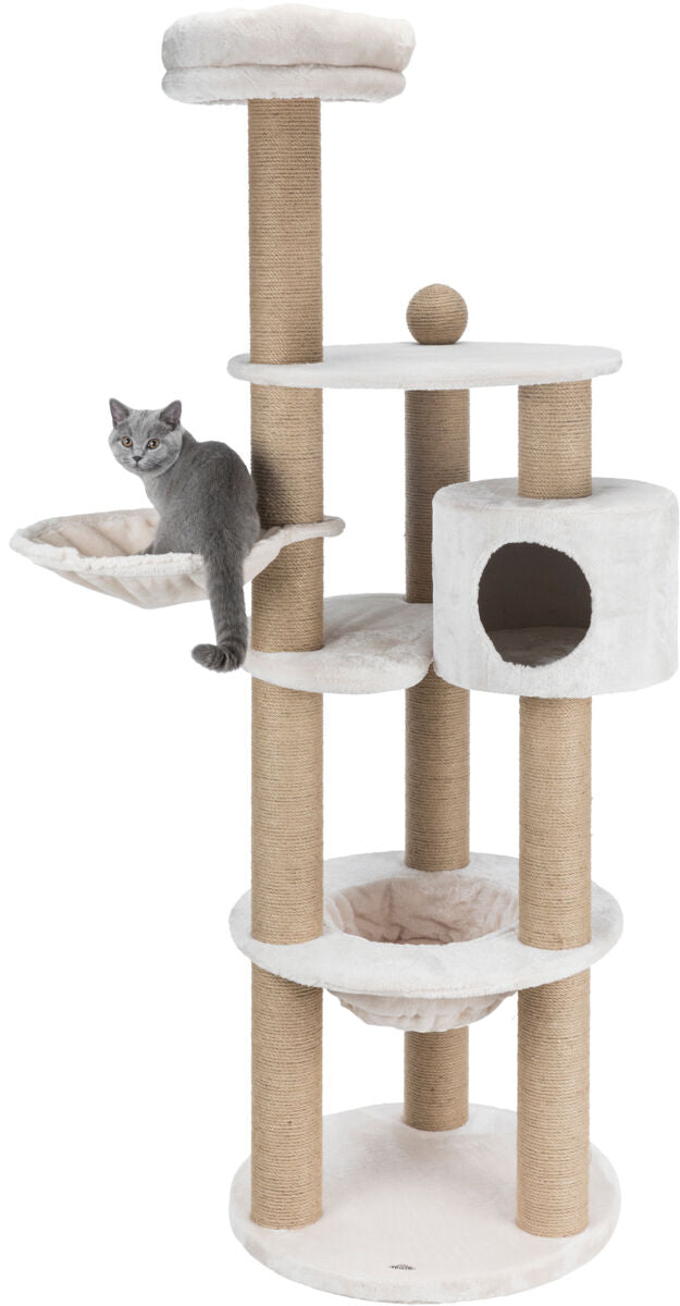 Der Trixie Kratzbaum Nigella in Lichtgrau bietet auf 177 cm Höhe grosszügigen Platz zum Klettern, Spielen und Entspannen. Die robusten Jutestämme fördern das natürliche Kratzverhalten, während die Höhle mit Plüschbezug, die gepolsterte Liegeplatte und das abnehmbare Kuschelbett komfortable Rückzugsorte für Ihre Katze schaffen. Durch die stabile Konstruktion ist der Kratzbaum ideal für aktive Katzen geeignet.