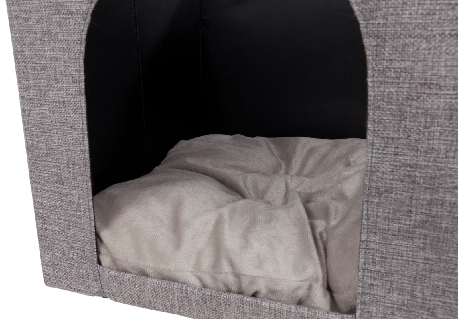 Die Trixie Kuschelhöhle Ella verwandelt Regalfächer in komfortable Schlaf- und Ruheplätze für Ihre Katze. Der graue Webstoffbezug ist robust und passt harmonisch in jedes Wohnambiente. Die faltbare Konstruktion erleichtert Handhabung und Lagerung, während das gesteppt gepolsterte Kissen mit Plüsch-Bezug für höchsten Komfort sorgt. Dank der Masse von 33 × 33 × 37 cm ist die Höhle perfekt für IKEA Kallax-Regale geeignet und bietet Ihrer Katze einen geschützten Rückzugsort.