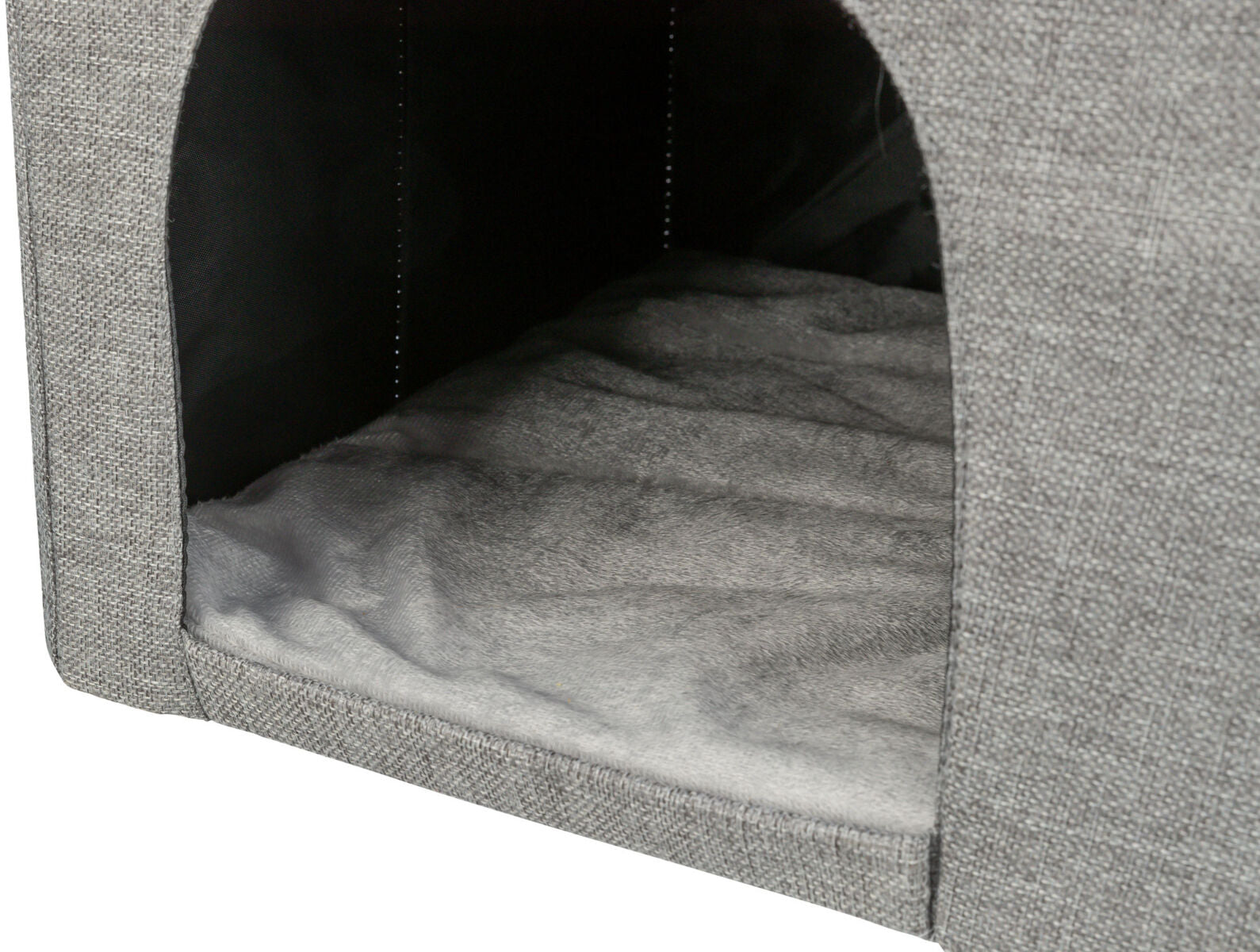 Die Trixie Kuschelhöhle Kimy bietet kleinen Hunden und grossen Katzen einen komfortablen Schlaf- und Rückzugsplatz. Der hellgraue Webstoff-/Polyesterbezug ist robust und pflegeleicht, während der faltbare Aufbau mit stabilem MDF-Rahmen für Sicherheit und Stabilität sorgt. Das abnehmbare, gepolsterte Kissen mit Plüsch-Bezug und Polyestervlies-Füllung bietet maximalen Liegekomfort. Dank des integrierten Staufachs und des Designs ist die Höhle praktisch, stylish und belastbar bis 20 kg.