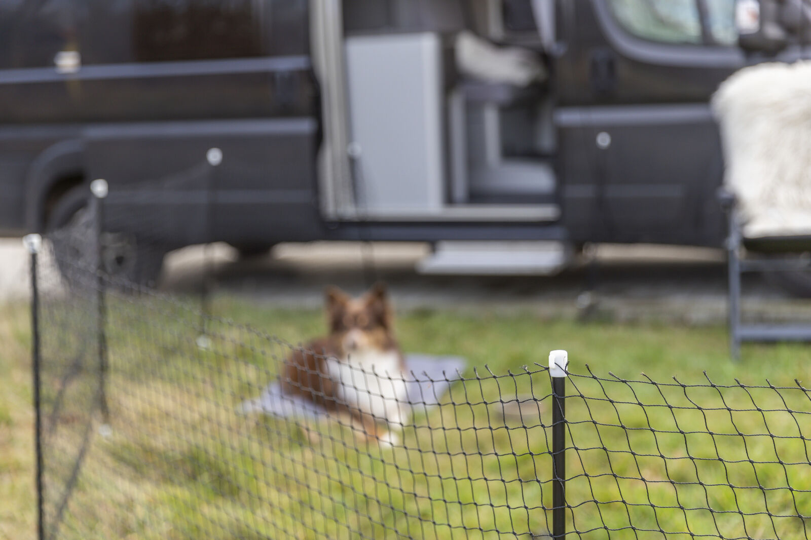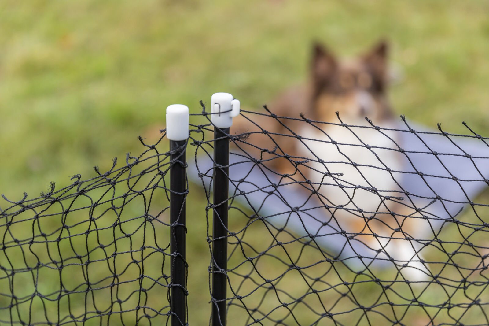 Der Zaun wird einfach auf der gewünschten Fläche aufgestellt, die Stangen in den Boden gesteckt und das Netz mit den Halteclips fixiert. So kann der Hund sicher innerhalb eines abgegrenzten Bereiches spielen oder ruhen.