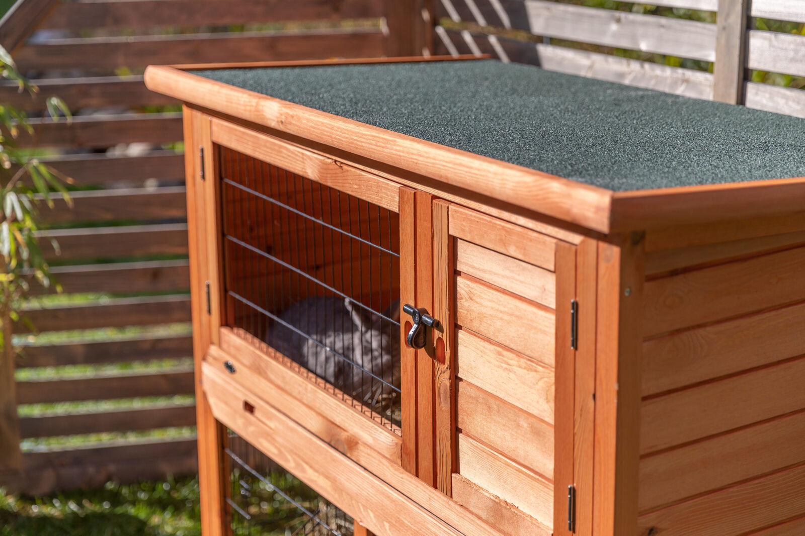 Der Trixie Natura Kaninchenstall mit Freigehege in Grösse S ist die perfekte Kombination aus sicherem Rückzugsort und integriertem Auslauf für kleine Kaninchen und Nager. Mit durchdachten Details wie einer verschliessbaren Bodenluke, doppelter Türverriegelung und pulverbeschichtetem Metallgitter bietet er optimalen Schutz vor Fressfeinden. Die robuste Bauweise aus lasiertem Kiefernholz sowie das wetterfeste Dach machen den Stall langlebig und pflegeleicht – ideal für den ganzjährigen Einsatz im Freien.