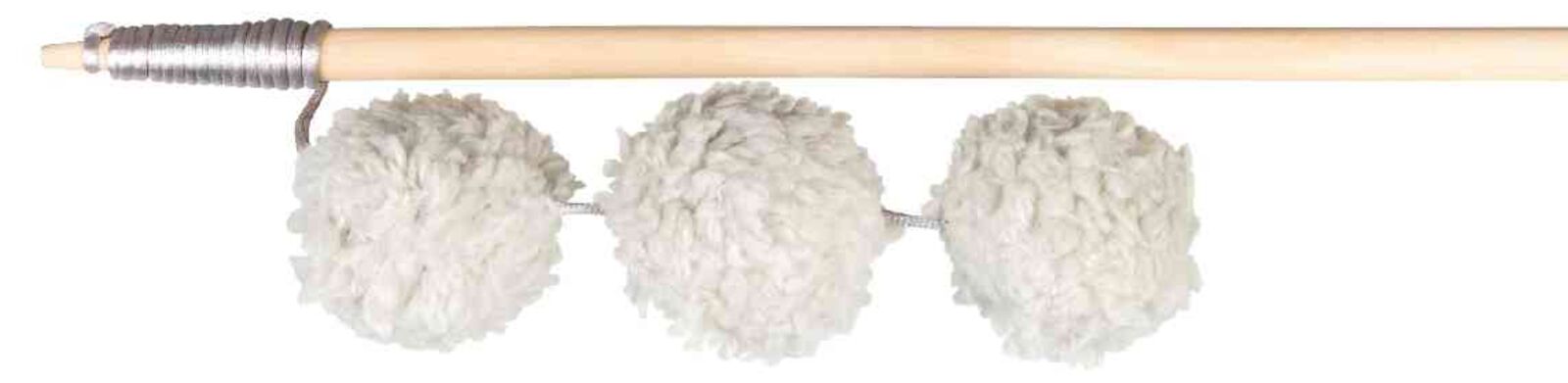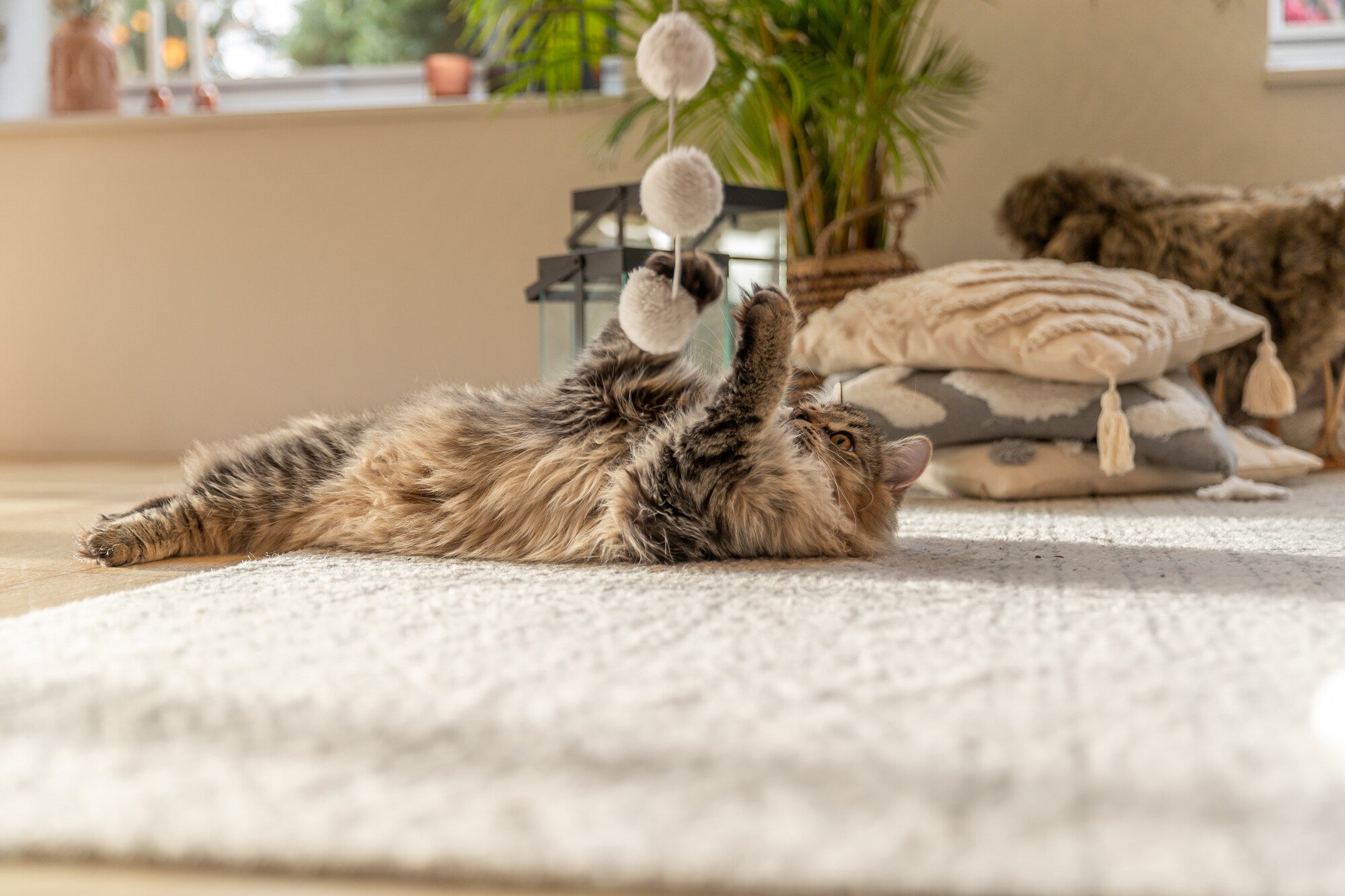 Angel in der Hand halten und die Bälle in bewegten, wechselnden Richtungen führen, um den Jagdtrieb der Katze zu aktivieren.