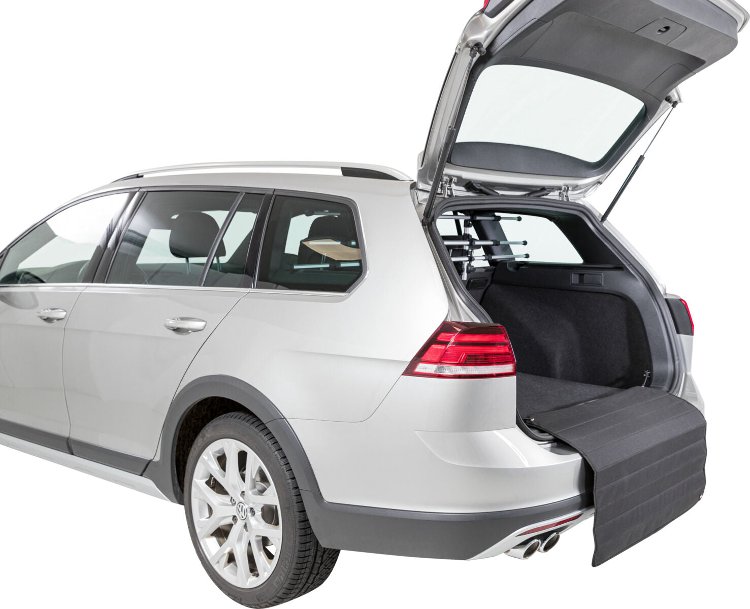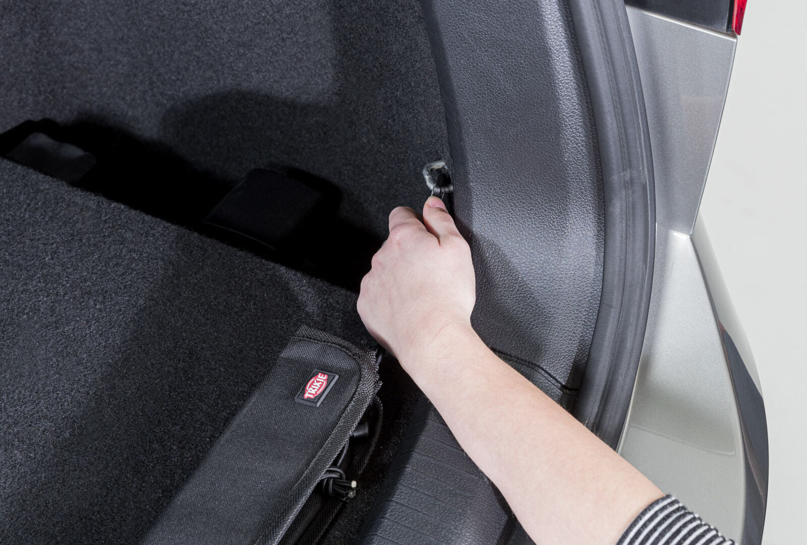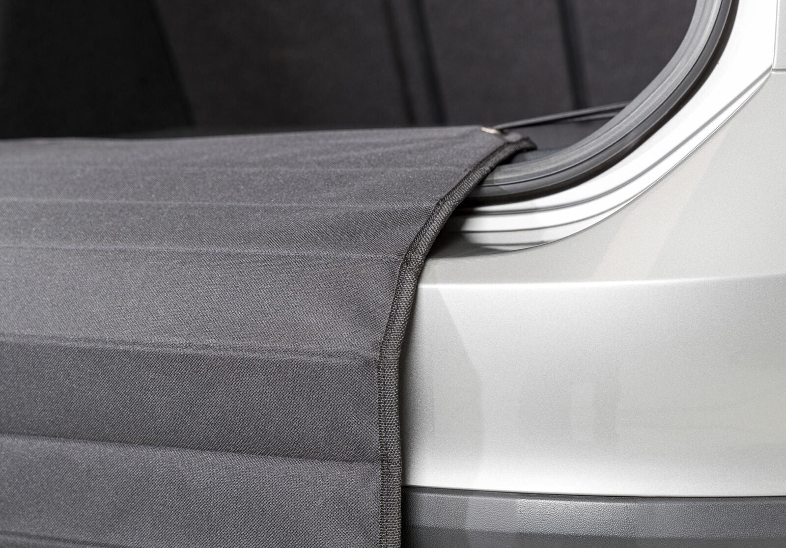 Die Schutzmatte wird am Kofferraumrand befestigt und deckt beim Auslegen die Stossstange ab. So kann der Hund sicher ein- und aussteigen, ohne das Fahrzeug zu beschädigen. Nach Gebrauch einfach abnehmen oder zusammenfalten und verstauen.