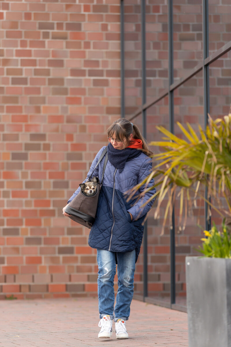 Ziehe die Tasche Alfie als Hüfttasche oder Sling-Bag über den Körper, passe Hüft- oder Umhängegurt an und stelle sicher, dass sie eng, aber komfortabel sitzt. Befülle die Fächer mit Leckerlis, Smartphone, Schlüssel oder Kotbeuteln. Nach Verschmutzung einfach mit einem feuchten Tuch abwischen und an der Luft trocknen lassen.
