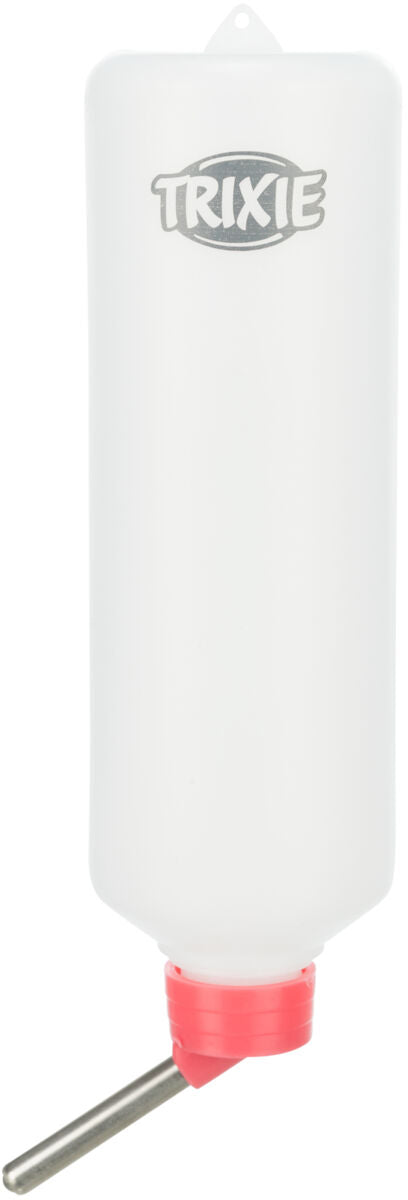Die Flasche wird mit frischem Wasser befüllt und mithilfe des Drahthalters im Käfig befestigt. Regelmäßige Reinigung sorgt für Hygiene und frisches Trinkwasser.