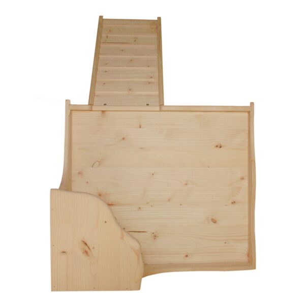 Die Heuburg Nager von Heimtierbedarf Resch ist ein durchdachtes und vielseitiges Häuschen für Kaninchen, Zwergkaninchen und Meerschweinchen. Das Produkt wird grösstenteils fertig montiert geliefert, lediglich die stabile Treppe muss mit den beiliegenden Schrauben befestigt werden. Gefertigt aus 100 % unbehandeltem, massivem Fichtenholz ist die Heuburg schadstofffrei, biologisch abbaubar und kann unbedenklich von Ihren Tieren angeknabbert werden. Die zwei Etagen bieten den Tieren gleichzeitig Futterplätze im Haus und auf der grossen Terrasse mit Aussicht. Zwei grosse Ein- und Ausgänge verhindern Streitigkeiten, und das Softline-Design mit gerundeten Ecken sorgt für Sicherheit ohne scharfe Kanten. Die verbesserte, feste Treppe garantiert sicheren Auf- und Abstieg.
