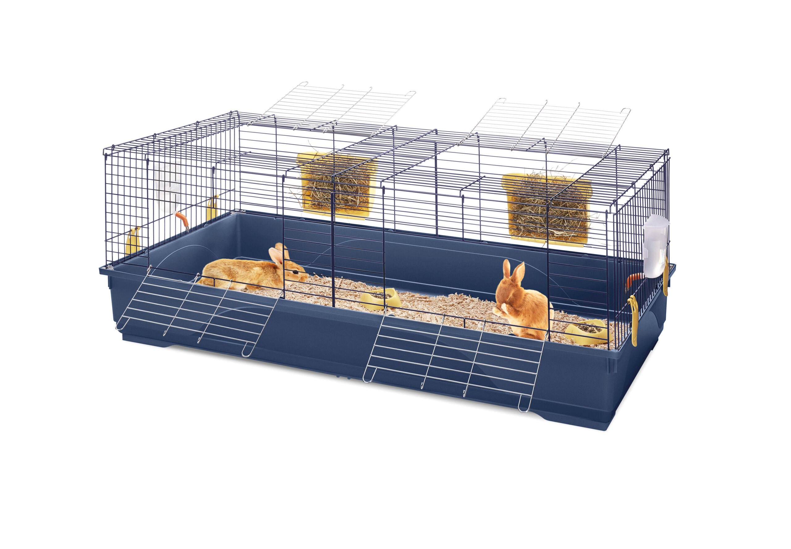 Der Käfig besteht aus pulverbeschichtetem Metallgitter und einer Kunststoffbodenwanne für einfache Reinigung und Langlebigkeit.