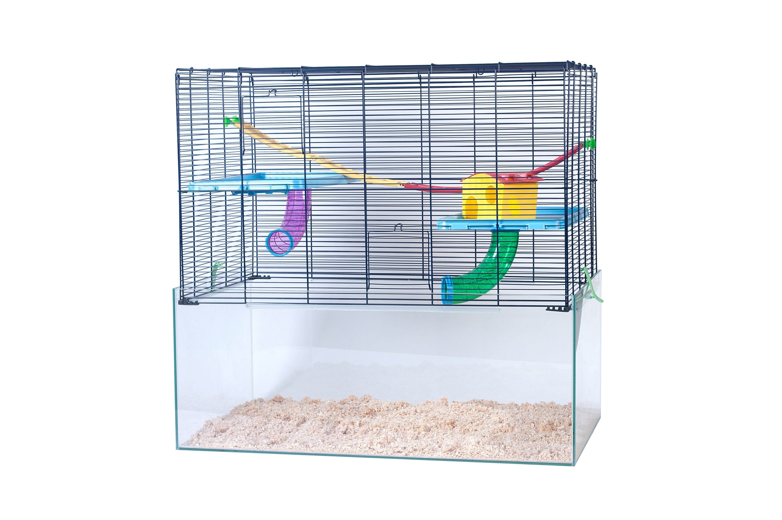 Der Behälter besteht aus klarem Kunststoff, der Käfigaufsatz aus pulverbeschichtetem Metallgitter, sicher und langlebig für kleine Nagetiere.